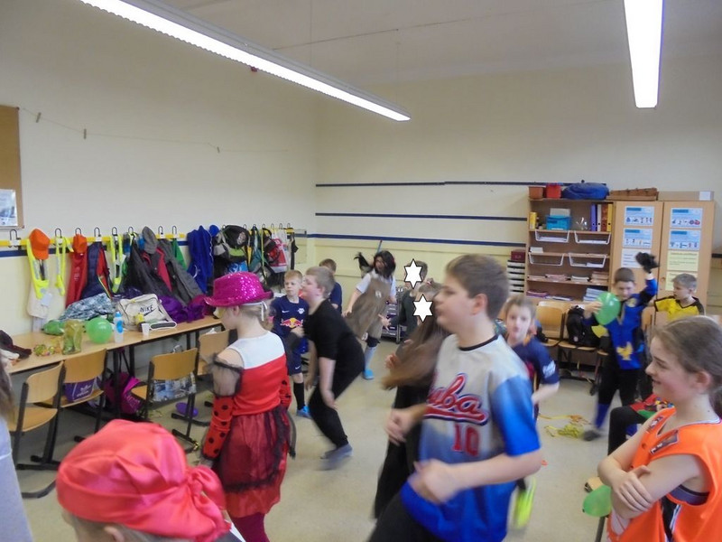 ... turbulent und mit großem Tamtam. In der letzten Schulwoche hatten wir zum letzten mal in unserer Grundschulzeit die Gelegenheit, uns zu verkleiden und eine lustige Faschingsparty zu feiern. Das haben wir natürlich ausgiebig genutzt. Unser Klassenzimmer verwandelte sich in eine Disco und wir tanzten in unseren fetzigen Kostümen den ganzen Vormittag. Wir vergnügten uns bei Luftballontanz, Stuhlpolonaise und Stopptanz. Unsere Kostüme durften wir stilecht beim Gang über den "Laufsteg" präsentieren.