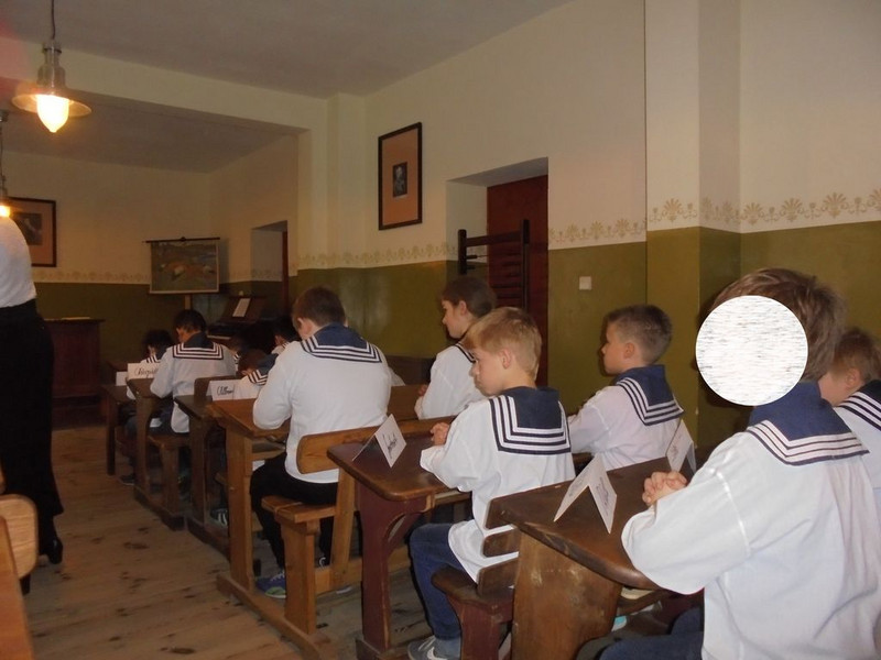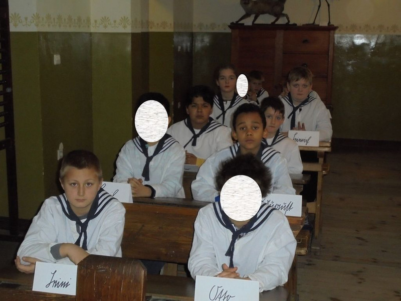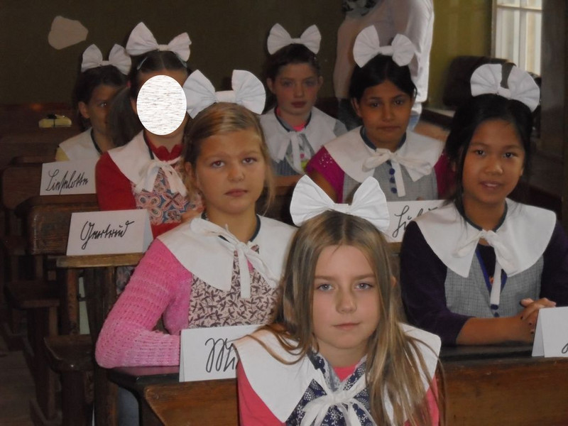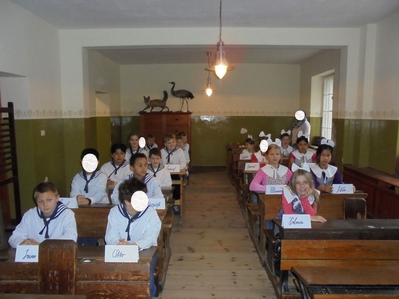 Nachdem wir uns vor einigen Wochen schon sehr ausführlich mit dem Thema "Schule früher" beschäftigt hatten, durften wir nun heute im Schulmuseum eine Schulstunde erleben, wie sie vor über 100 Jahren hätte stattfinden können. Nachdem wir von der Museumspädagogin Frau Haupt begrüßt worden waren, erklärte sie uns, wie das Rollenspiel ablaufen sollte und welches Verhalten sie von uns erwartete. Die zwei wichtigsten Regeln waren: - Aufstehen, wenn man aufgerufen wird! - Immer im Satz antworten! Danach erhielten wir unsere Schulkleidung. Die Jungen zogen ein weißes Hemd und einen Matrosenkragen über, die Mädchen bekamen eine Schürze einen weißen Kragen und eine weiße Schleife ins Haar. Nun konnte es losgehen. Nach der Begrüßung durch das Fräulein Lehrerin, mussten wir unsere Hände vorzeigen. Wir sangen ein Begrüßungslied und schrieben einige Buchstaben mit einem Griffel auf die Schiefertafel. Danach übten wir das Geburtstagslied für den Kaiser. Übrigens: Unser lieber Herr Kaiser hat am 27. Januar Geburtstag ;)). Zum Schluss lobte uns das Fräulein Lehrerin für unsere Disziplin. Leider waren wir sehr vergesslich und machten so dem Fräulein Lehrerin das Leben schwer. Obwohl sie die zwei Regeln mehrfach wiederholt hatte und sie sogar an die Tafel schrieb, vergaßen die meisten Kinder sie immer wieder. Dadurch war das Rollenspiel etwas holprig und es konnte kein Kind mit der Eselsbank bestraft werden. So viele Kinder hätten dort keinen Platz gefunden.