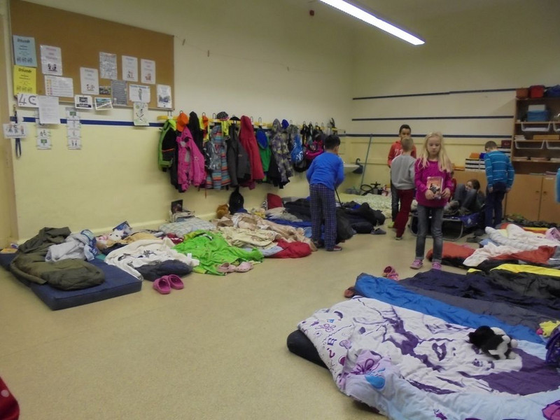 ... mit der langersehnten Lesenacht. Am Donnerstag durften wir dann endlich in der Schule übernachten. Nachdem Frau Neise den letzten Termin verschoben hatte freuten wir uns schon riesig auf die Übernachtung und waren dementsprechend aufgeregt. Den ganzen Vormittag löcherten wir sie mit unseren Fragen. Wann sollen wir da sein? Wie viele Bücher darf ich mitbringen? Wie viele Kuscheltiere dürfen mitkommen? Brauche ich eine Luftmatratze? Darf es auch ein Feldbett sein? Wie lange dürfen wir am Freitag schlafen? Wann soll ich die Frühstückssachen mitbringen? In der letzten Schulstunde räumten wir noch das Klassenzimmer aus und verbrachten unsere Hortgruppenzeit in einem leeren Zimmer. Am Abend trafen wir uns überpünktlich im Klassenzimmer (Das mit der Uhrzeit müssen wir noch einmal üben :)) Wir bauten unsere Betten auf und hätten am liebsten sofort die Schlafsachen angezogen. Damit mussten wir uns noch ein wenig gedulden. Als endlich alle Kinder da waren und alle Schlafstätten standen, gab es kein Halten mehr. Wir sprangen in unsere Schlafanzüge. Was wäre eine Pyjamaparty auch in normalen Klamotten? Einige Kinder gingen dann in die Klassen 1c und 2c und lasen dort etwas aus ihren Büchern vor. Das hat sowohl den Kleinen als auch uns viel Freude bereitet. In unserem Klassenzimmer spielten wir, Frau Schulz las einigen Kindern etwas vor, wir quatschten und freuten uns über den Besuch von Frau Kirmse, unserer neuen Lehramtsanwärterin. Gegen 10 Uhr wurde es langsam ruhiger, wir lasen in unseren Betten und irgendwann hieß es: "Licht aus." Frau Neise las uns noch eine Geschichte vor und dann waren die meisten Kinder schon auf dem Weg ins Traumland. Nach einer Weile wurde unsere Nachtruhe dann doch noch einmal gestört. Und es waren nicht die Kinder, die vor Kichern fast aus ihren Betten fielen. Frau Zieger bekam plötzlich große Angst, dass sie von der Tafel, die über ihr schwebte, geköpft werden könnte. Diese Vorstellung brachte sie und Frau Neise so zum Lachen, dass sie sich nicht so schnell beruhigen konnten und alle Kinder erst einmal wieder munter waren. Irgendwann schlief aber auch die letzte unruhige Seele ein.