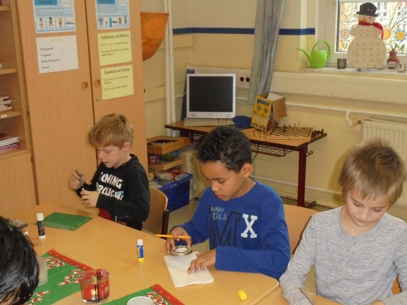 Seit der ersten Klasse genießen wir ab dem 1.Dezember die erste gemeinsame Stunde im Sitzkreis. Wir gestalten einen lebendigen Adventskalender und entzünden an jedem Tag Kerzen - erst eine, dann zwei, dann drei ..., singen gemeinsam Weihnachtslieder und öffnen die Kalendertürchen. Dann liest uns Frau Neise eine Geschichte vor, in diesem Jahr war es ein Weihnachtskrimi, der von einem verschwundenen Weihnachtsengel handelte.