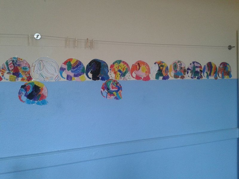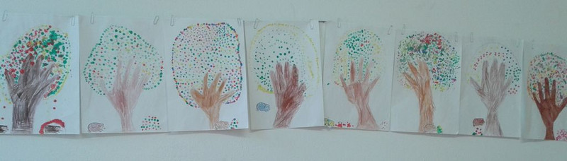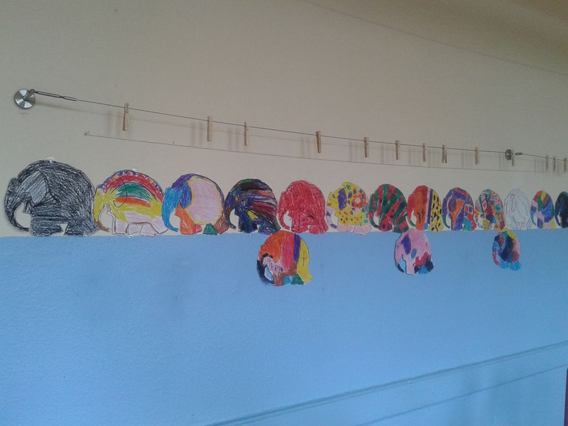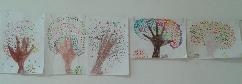 Im Kunstunterricht durften wir schon mit verschiedenen Materialien arbeiten. Los ging es mit Buntstiften, denn auch sauberes Ausmalen will gelernt sein. Als wir das /e/ kennen lernten, lachten wir über Elmars Geschichte und staunen seitdem über eine bunte Elefantenparade in unserem Klassenraum. Anschließend taten wir es der Natur gleich und tupften die Blätter bunt. Unsere Arme und Hände halfen uns einen Baum zu zeichnen. Mit Wattestäbchen und Temperafarben wurden unsere Bäume herbstlich bunt.