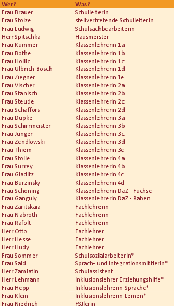 Im Folgenden finden Sie eine aktuelle Übersicht aller an der Schule beschäftigten Lehr- und Fachkräfte. Alle Klassenlehrerinnen mit Klassentier und Hortbetreuung sind hier zu finden, die mit * gekennzeichneten Personen sind hier nochmal genauer mit ihrem Aufgabengebiet erklärt.