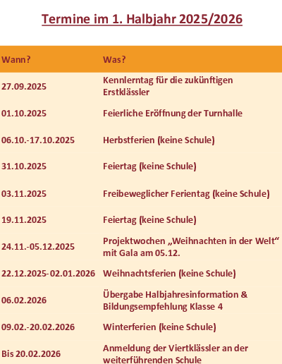 Hier finden Sie wichtige Termine im ersten Halbjahr des Schuljahres 2025/2026.