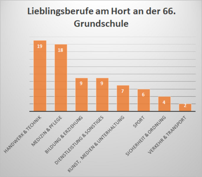 Auch Lehrer, Fußballer, Bäcker und Bauarbeiter wurde häufig genannt. Als wir alle Berufe in Gruppen eingeteilt haben, kam heraus, dass viele Kinder Berufe im Bereich Handwerk und Technik oder Medizin und Pflege spannend finden. Das zeigt uns, dass viele Kinder gerne mit ihren Händen arbeiten oder anderen helfen wollen. Es gab aber auch kreative Wünsche, wie Youtuber, Erfinder oder Künstler.