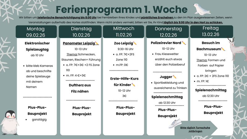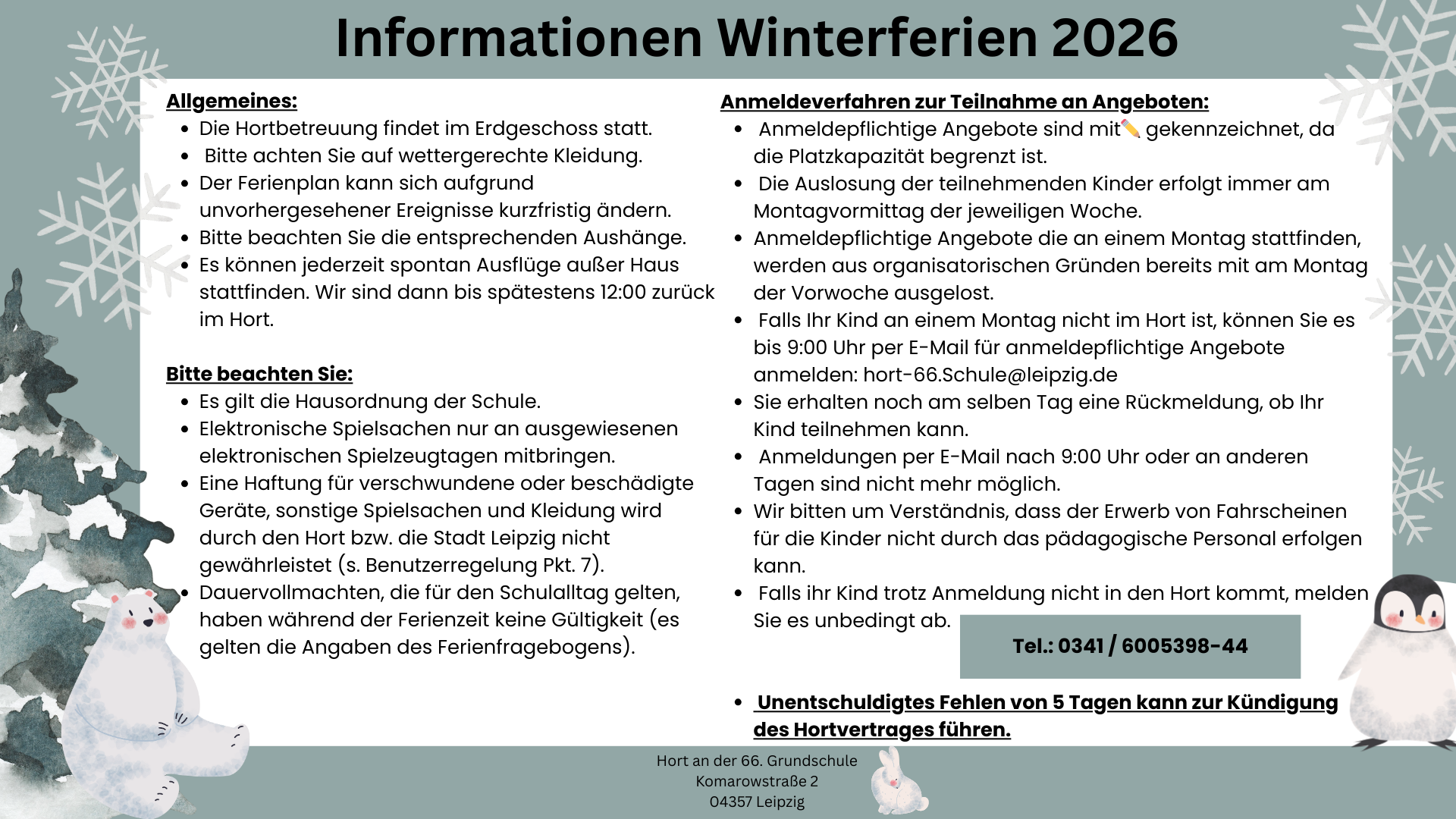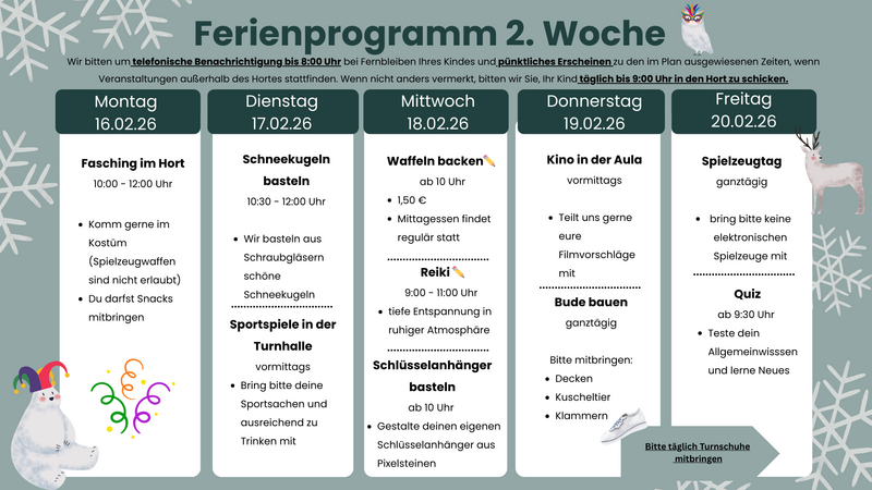 Wenn Ihr Kind für die Ferien angemeldet ist, aber doch nicht in den Hort kommt, möchten wir Sie dringend daran erinnern, Ihr Kind bis 9 Uhr abzumelden.