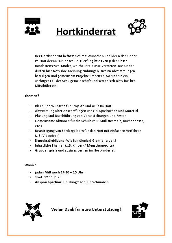 Der Kinderrat erfasst Probleme, Wünsche und Anfragen der Kinder, welche darauf ausgewertet und bearbeitet werden. Die Kinder werden dadurch in die Gestaltung des Schul- und Hortalltags einbezogen.