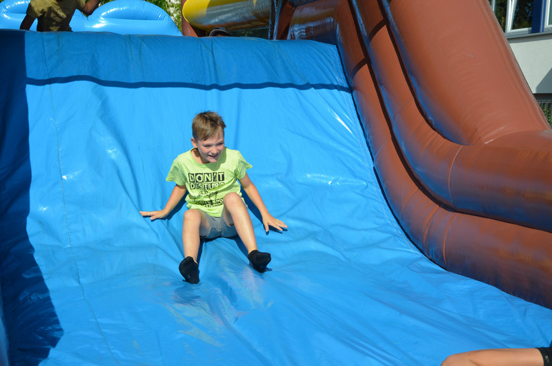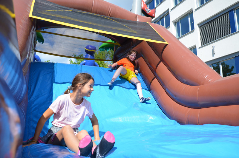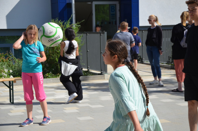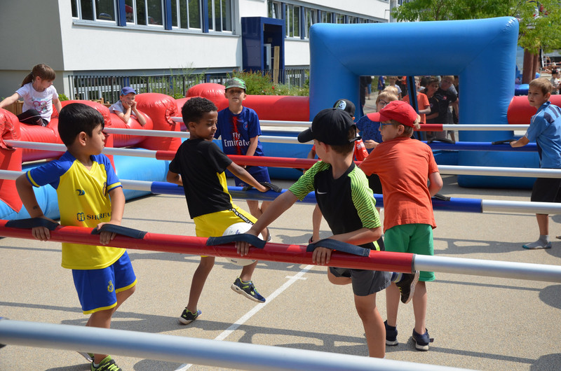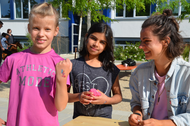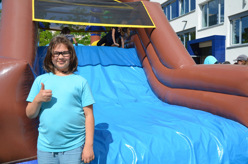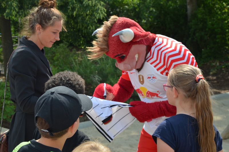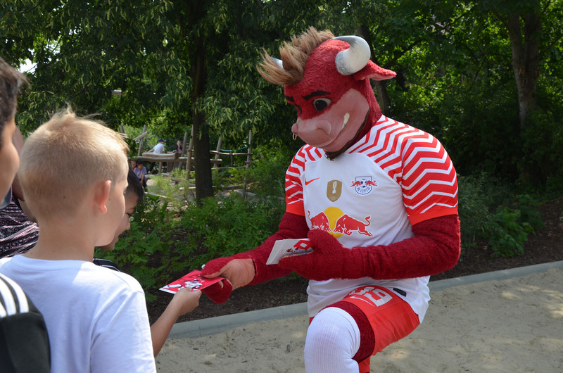 Das Schuljahr war anstrengend, die Zeugnisnoten stehen fest und bei der Hitze kann sich kaum noch jemand konzentrieren. Darum haben sich in der letzten Schulwoche vor den Sommerferien alle den Spiel- und Spaßtag mehr als verdient. Bei strahlendem Sonnenschein konnten die Kinder den Tag auf dem Schulhof in vollen Zügen genießen. Es gab zahlreiche Stationen, die für jede Menge Spaß und Abwechslung sorgten. Eine der Attraktionen war die Piratenhüpfburg, eine aufblasbare Hindernisbahn, auf der die Kinder nach Herzenslust herumspringen, klettern und rutschen durften. Für eine erfrischende Abkühlung sorgte die Wasserbaustelle, an der die Kinder ein eigenes Wassernetz konstruieren konnten. Auch an der Baustelle fanden unsere Baumeister und Baumeisterinnen genug Material zum Stapeln und Konstruieren. Für unsere Tierliebhaber gab es einen kleinen Ponyhof, auf dem die Kinder die Möglichkeit hatten, die fahrbaren Pferdchen zu reiten und zu striegeln. Sportlich wurde es beim Tischtennis und beim Faustball. Ein menschlicher Riesenkicker sorgte für spannende Fußballmatches, bei denen die Kinder ihr Können unter Beweis stellen konnten. Eine weitere sportliche Herausforderung war die endlose Kletterwand, die ganz schön anstrengend war und viel Geschick erforderte. Wer es ein bisschen ruhiger mag, konnte am Barfußpfad verschiedene Materialien unter den Füßen spüren und so seine Sinne schärfen. Auch bei der Tatoostation war von Drachen bis Meerjungfrauen für jeden etwas dabei. Besonders Aufregend war dann noch der Besuch vom RB-Maskottchen Bulli. Er war zum ersten Mal an unserer Schule und alle Kinder hatten die Möglichkeit, sich ein Autogramm und ein gemeinsames Foto zu ergattern.
