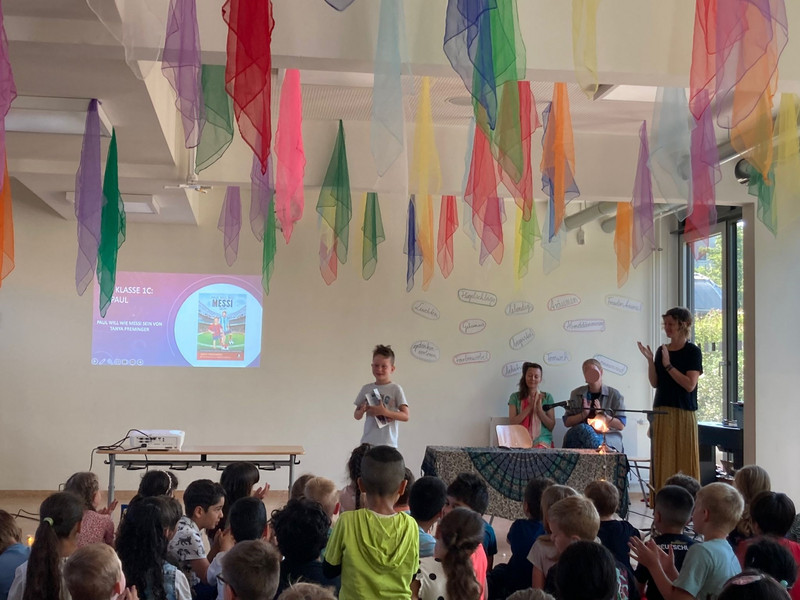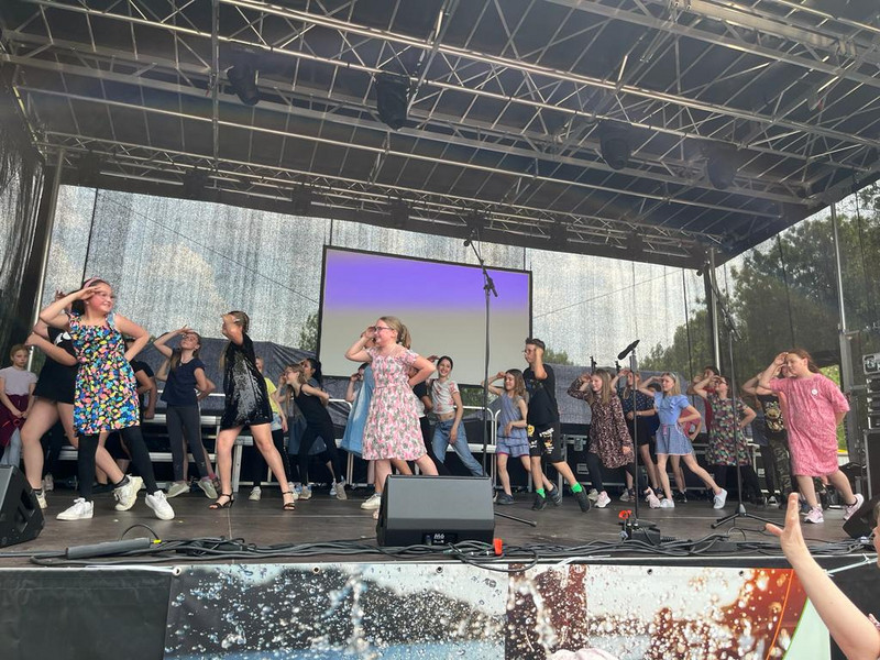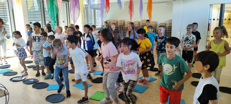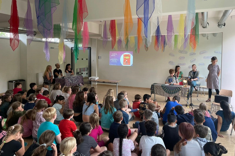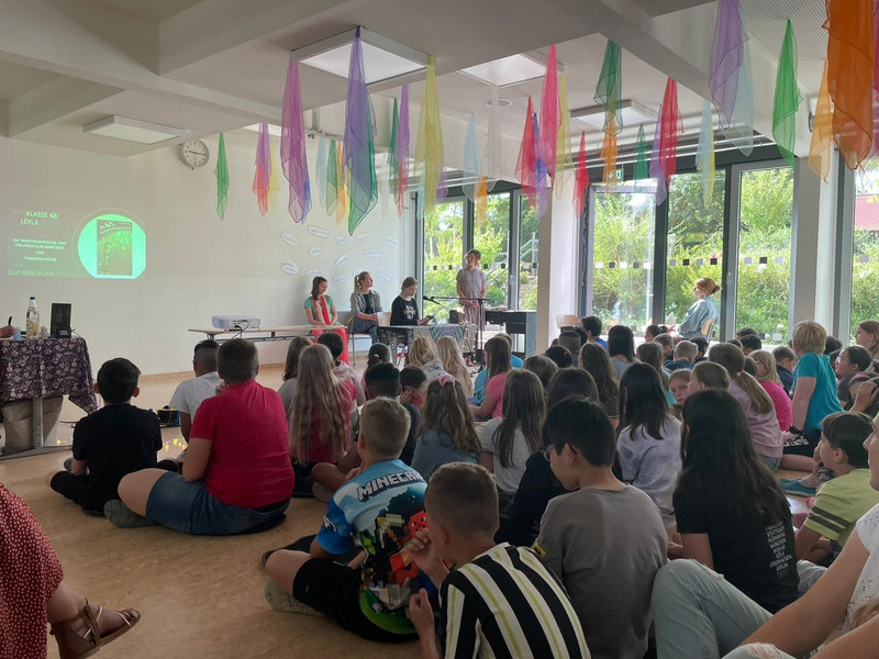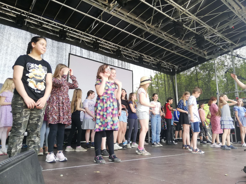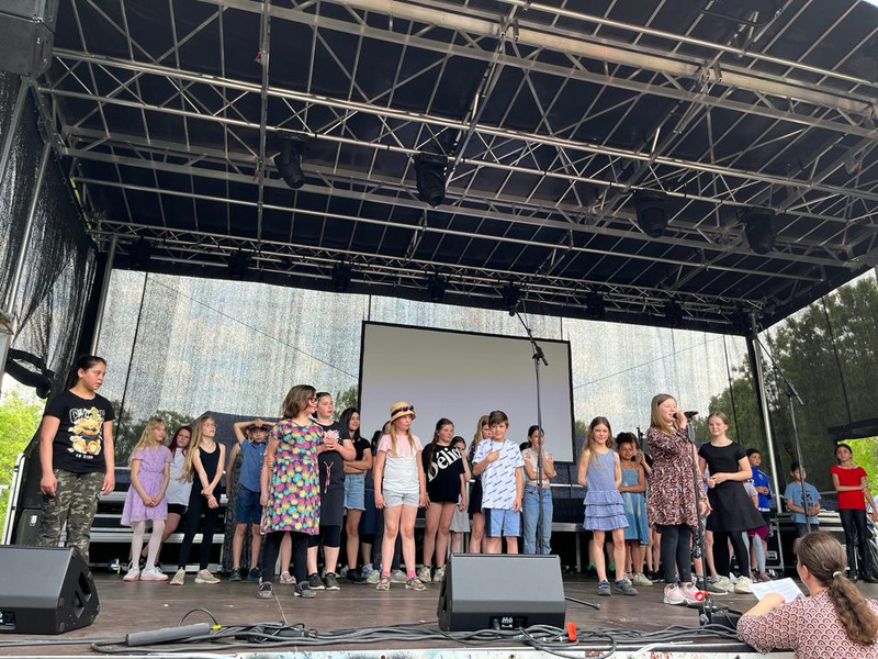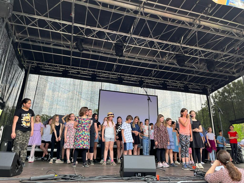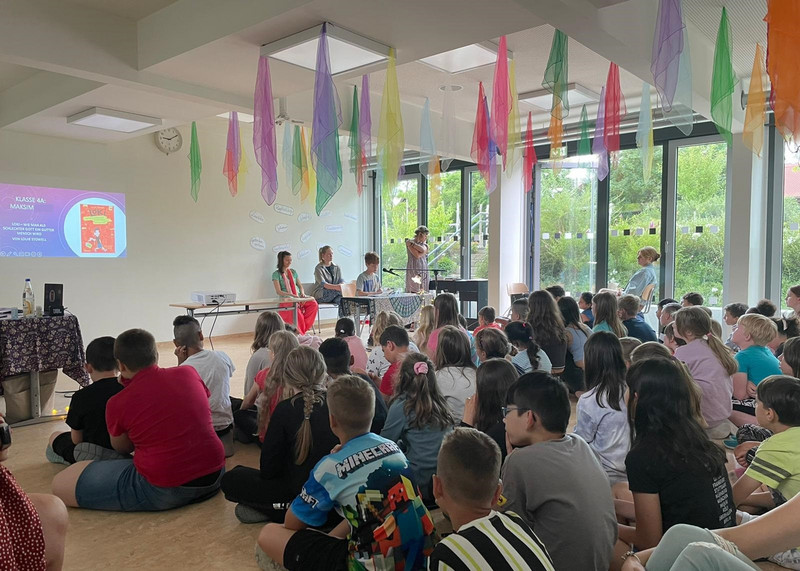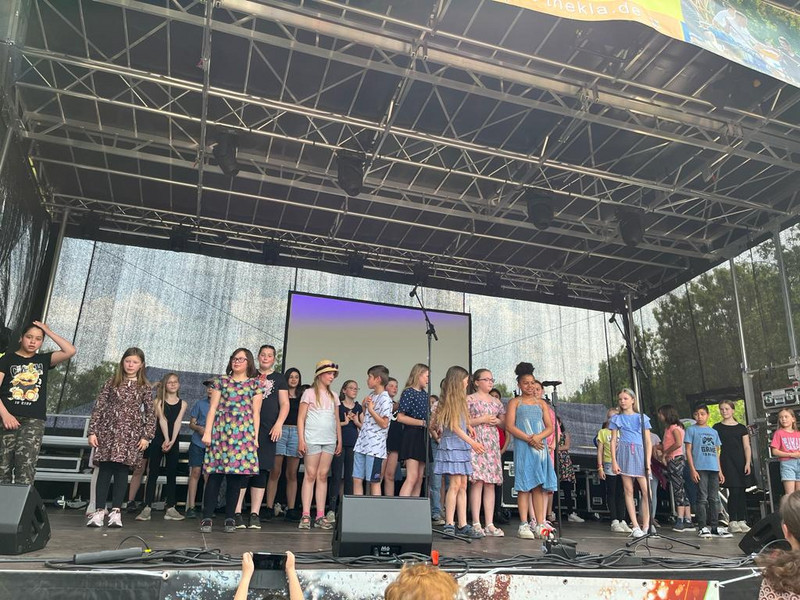 In der vierten Klasse steht jedes Jahr eine besondere Mutprobe an: der Auftritt beim Wasserfest am Baggersee auf der großen Bühne vor sehr vielen bekannten und unbekannten Leuten. Dafür haben die Schüler und Schülerinnen mit Frau Jünger wochenlang geprobt und ein kleines Programm auf die Beine gestellt. Es gab eine kleine Piratenreise mit einer Bodypercussion zum Soundtrack von Fluch der Karibik, einem Tanz zu Wellerman und zum Abschluss haben die Kinder noch Somewhere over the rainbow gesungen. Das Publikum war so begeistert, dass die vierten Klassen sogar noch eine Zugabe geben sollten. Wir fanden den Auftritt sehr gelungen und die Kinder waren ganz schön mutig!