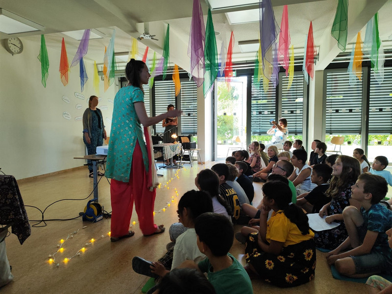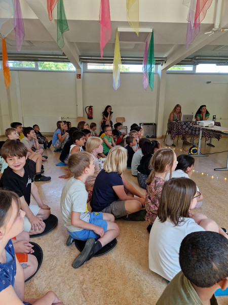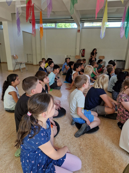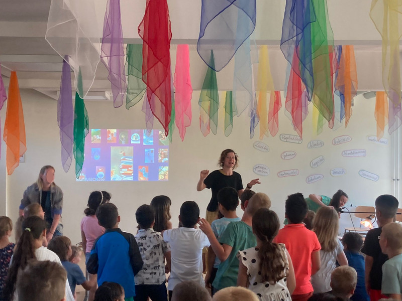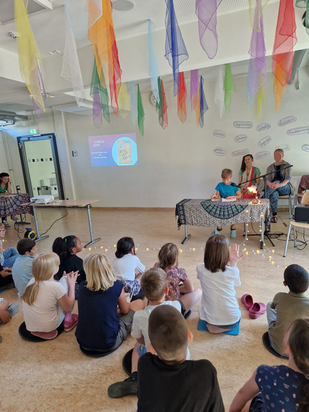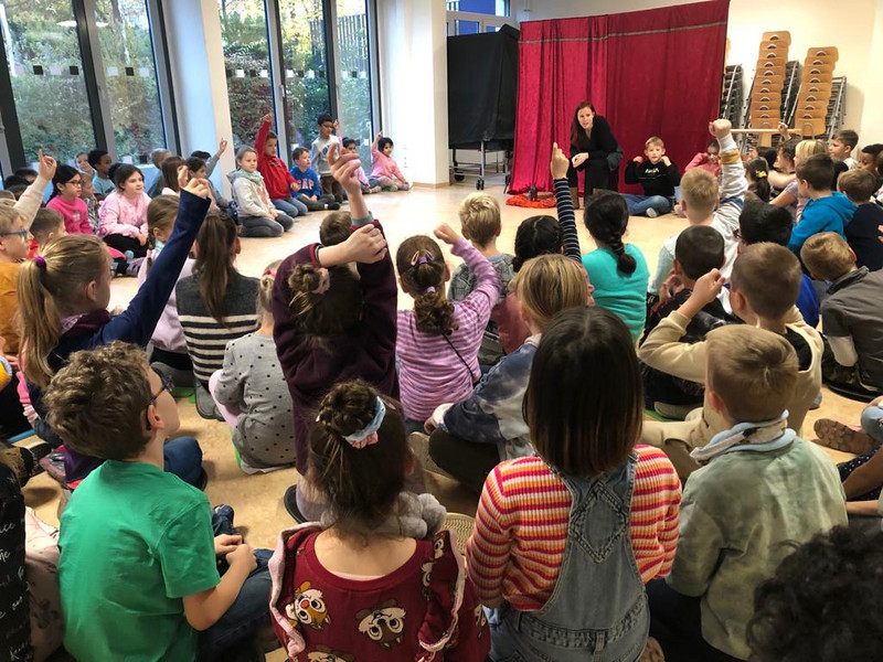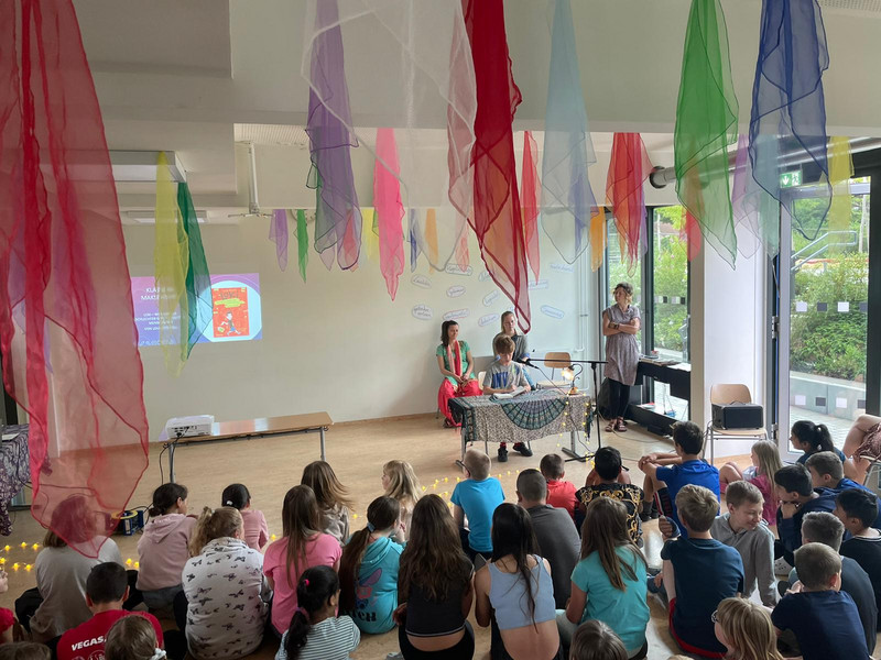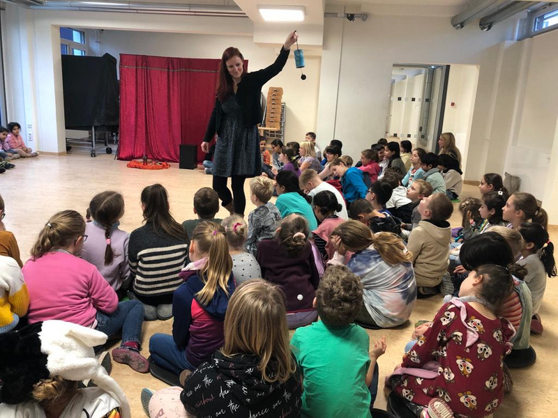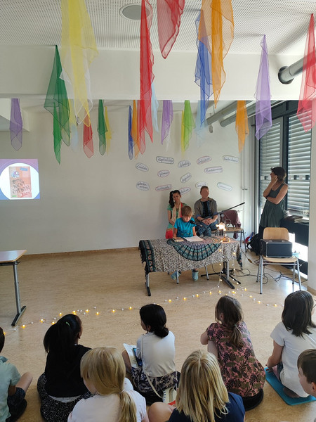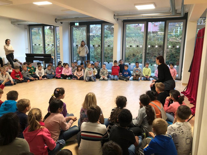 Als weiterem Programmpunkt durften in der Projektwoche endlich mal alle Kinder in den Genuss des Erzählraumes kommen. Die Geschichtenerzählerin, die sonst nur die zweiten Klassen besucht, hat eine Geschichte von Wolf und der Steinsuppe erzählt und alle haben gespannt zugehört.