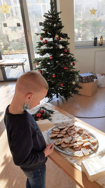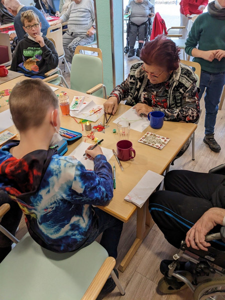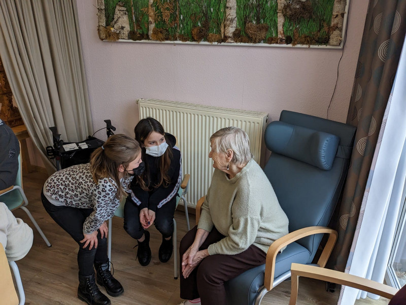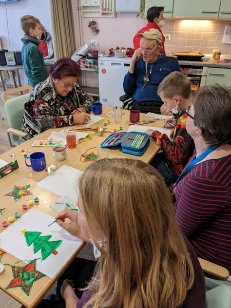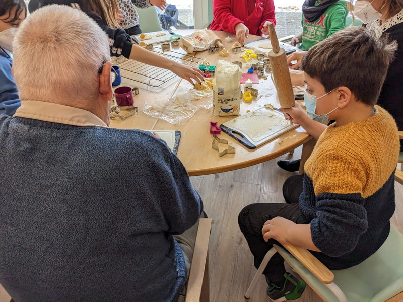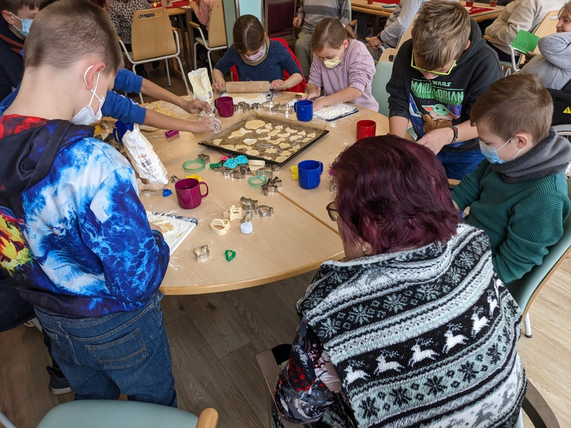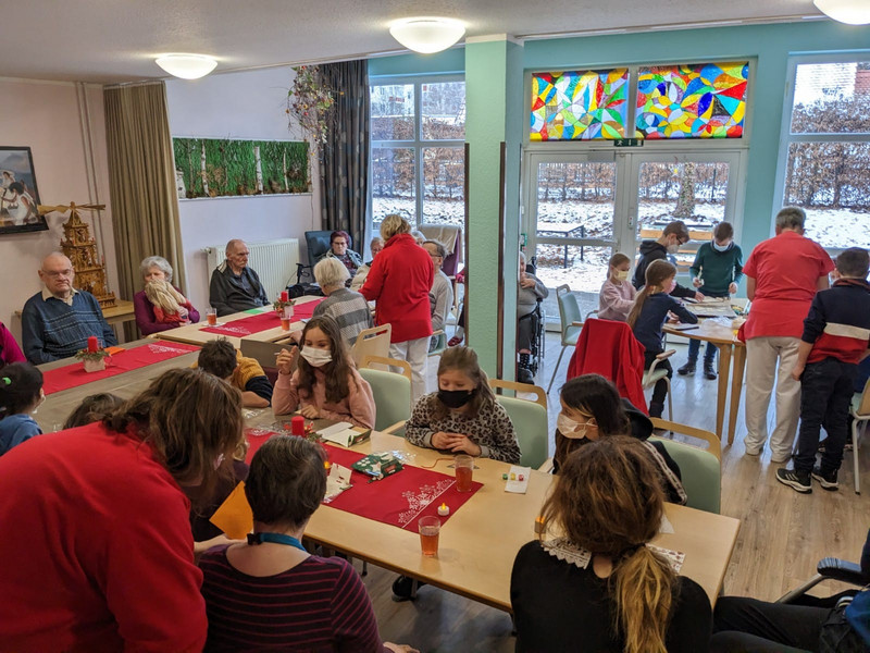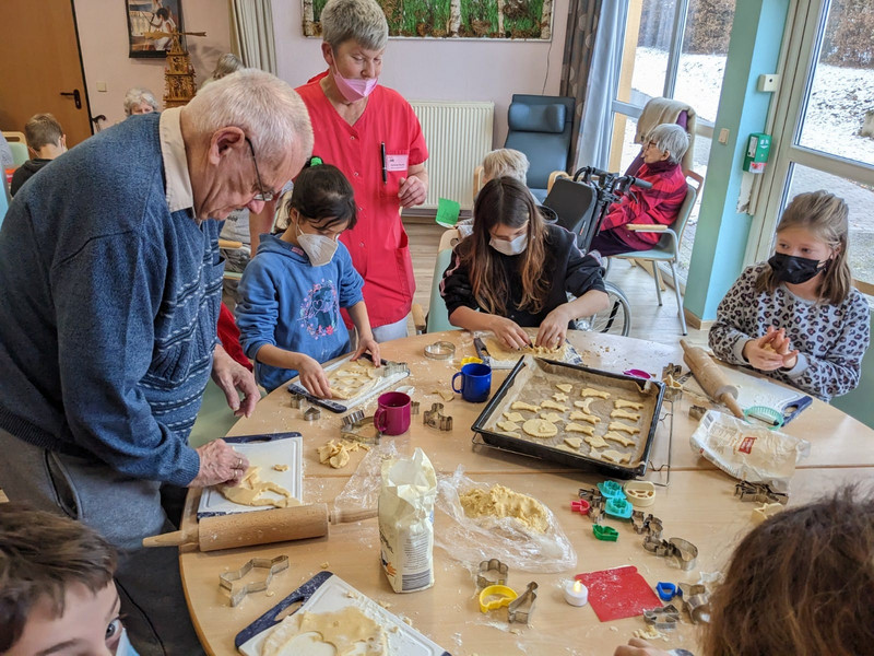 In der Froschklasse hat sich mit den Jahren eine schöne Tradition entwickelt: Immer in der Vorweihnachtszeit besuchen sie die SeniorInnen im Gerontopsychiatrischen Pflegeheim „Marie Juchacz“. Die Kinder freuen sich darauf immer schon lange vorher und sind ganz aufgeregt. Gemeinsam mit den Seniorinnen und Senioren wird gesungen, gebacken und gebastelt, bis jeder in Weihnachtsstimmung gekommen ist. Der Austausch mit der anderen Generation ist für beide Seiten spannend und bleibt noch lange in Erinnerung. Hier ein paar Eindrücke vom Besuch: