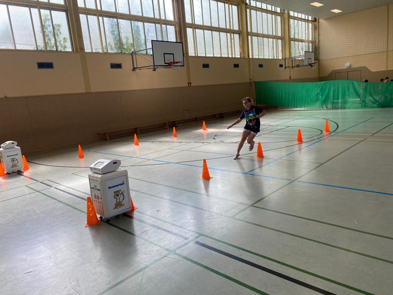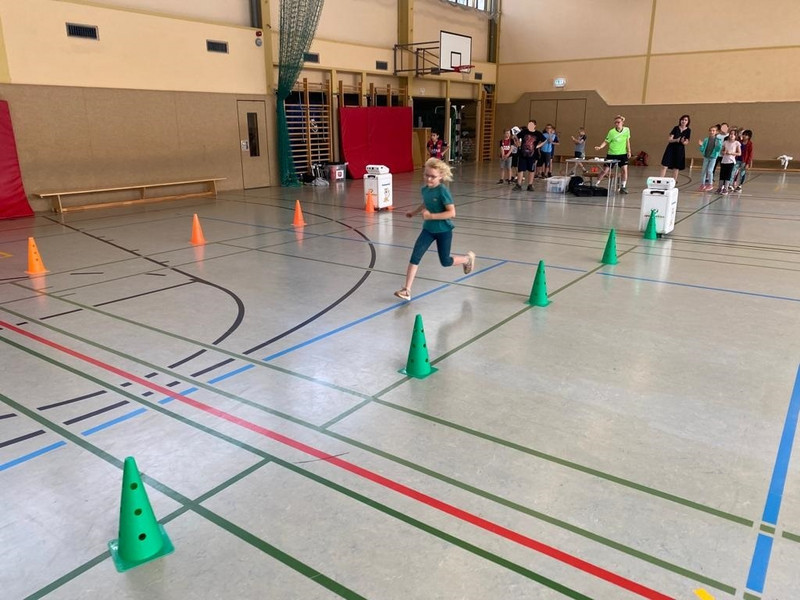 Die Kinder der ersten und zweiten Klassen erwartete in der Turnhalle ein abwechslungsreicher Parcours. Mit viel Geschick und Ausdauer meisterten die Schülerinnen und Schüler die Herausforderungen und zeigten dabei ihre sportlichen Talente. Für die dritten und vierten Klassen gab es den Kindersprint und ein Zwei-Felder-Ball-Turnier in der Turnhalle. Hier konnten die Kinder ihre Teamfähigkeit und ihr Ballgefühl zeigen. Mit viel Eifer kämpften sie um den Ball und versuchten, ihn ins gegnerische Feld zu befördern. Es wurde viel angefeuert und gejubelt, während die Teams um den Sieg kämpften. Auf dem Sportplatz konnten die jungen Athletinnen und Athleten bei bestem Wetter ihre Schnelligkeit sowie ihre Sprung- und Wurfkraft unter Beweis stellen. Die Zuschauer waren begeistert von den flinken Beinen der kleinen Sprinterinnen und Sprinter.
