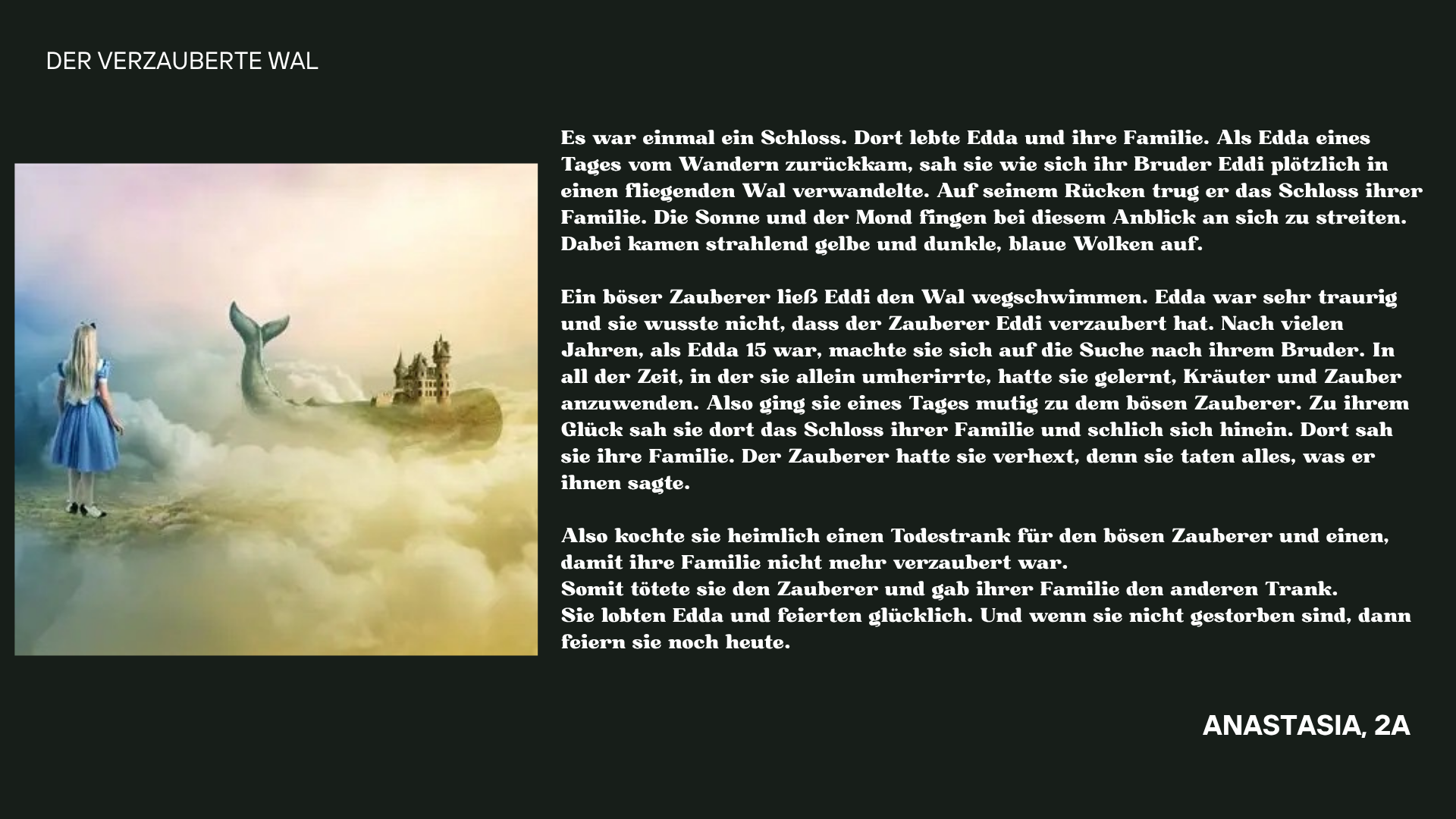 Anastasia aus der Klasse 2a hat eine fantasievolle Geschichte im Deutschunterricht geschrieben.