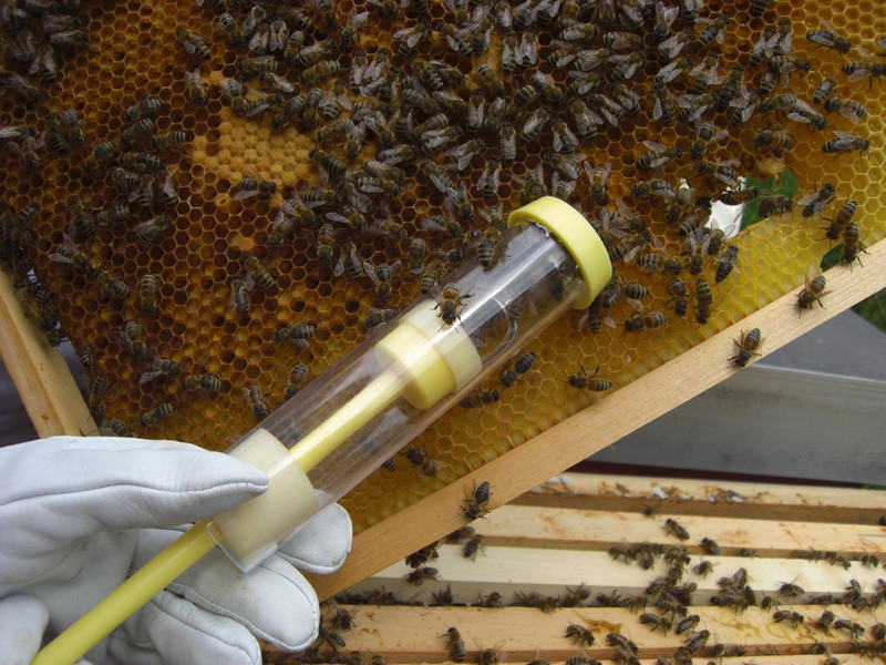 Die Bienenkönigin wird im Käfig in Sicherheit gebracht, damit sie nicht verloren geht.
