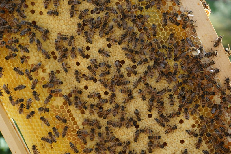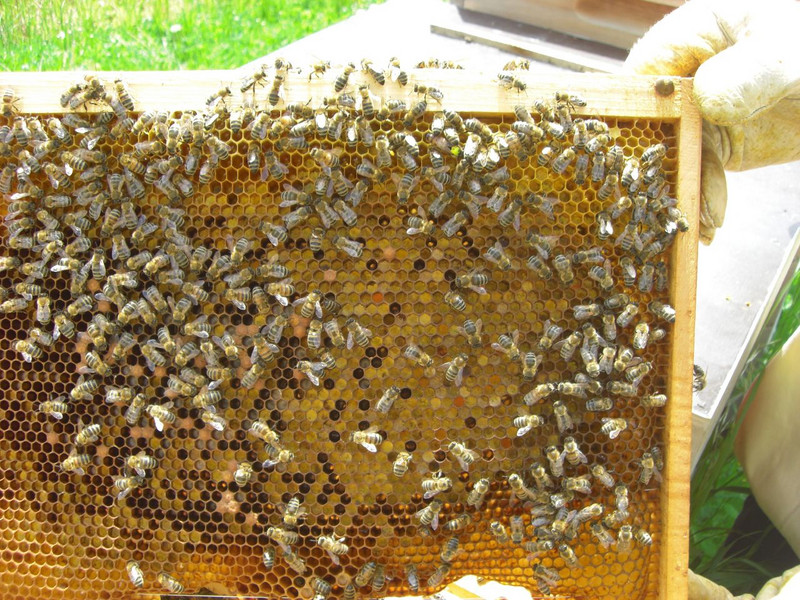 Eine Wabe mit großer Drohnenbrut wird aus dem Volk entfernt, damit sich die Varoa- Milbe nicht vermehren kann.