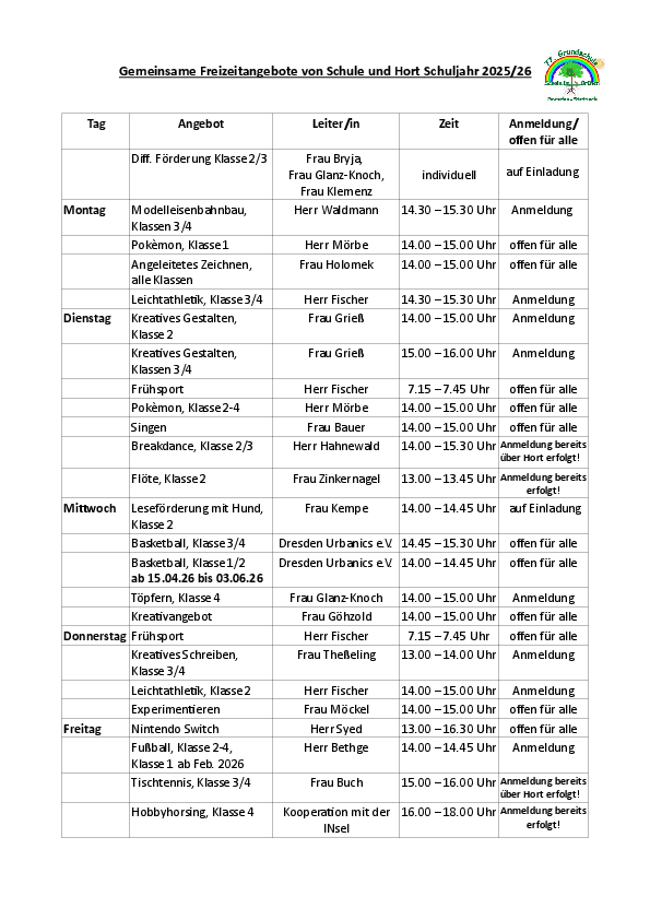 Ganztagesangebote sind Kurse, die vor oder nach dem offiziellen Unterricht angeboten werden. Die Kinder unserer Schule können aus einer Palette von zahlreichen Kursen wählen. Die Teilnahme an diesen Angeboten ist freiwillig.