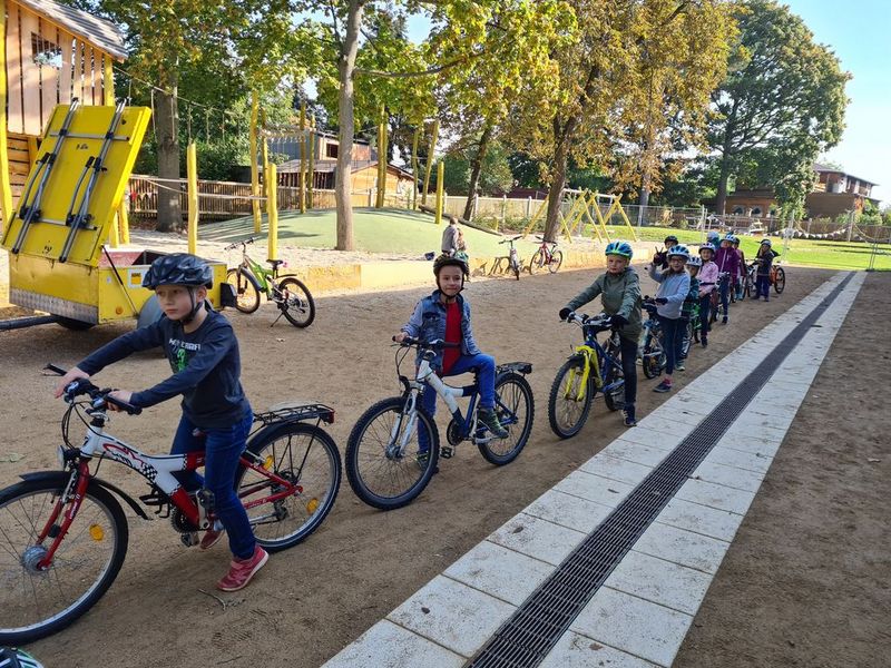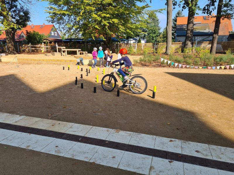 Es gab eine kleine Rampe und auch ein Hindernis, wo ein Griff an einer Kette befestigt war. Außerdem mussten wir durch kleine Klötze und um Verkehrskegel fahren. Zuerst durften alle Kinder eine Probefahrt machen. Dann zählte es. Es war ganz schön schwierig, aber wir haben es geschafft.