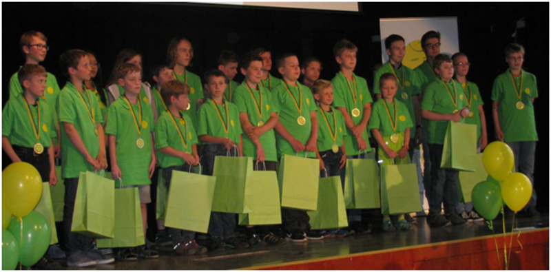 Dann wurde es noch einmal spannend. Der Moderator verkündete, dass es von den Finalteilnehmern in Berlin einige unter die besten 10 ihrer Klassenstufe deutschlandweit geschafft haben. Diesmal wurde mit der 3. Klasse begonnen. Zwei Drittklässler wurden auf die Bühne gerufen: Leopold war dabei! Er hat deutschlandweit den 3. Platz in der Klassenstufe 3 erreicht. Von den Viertklässlern hatte es ein Kind unter die Top 10 in Deutschland geschafft: es wurde mein Name aufgerufen. Ich habe deutschlandweit unter allen Viertklässlern den 2. Platz erreicht!