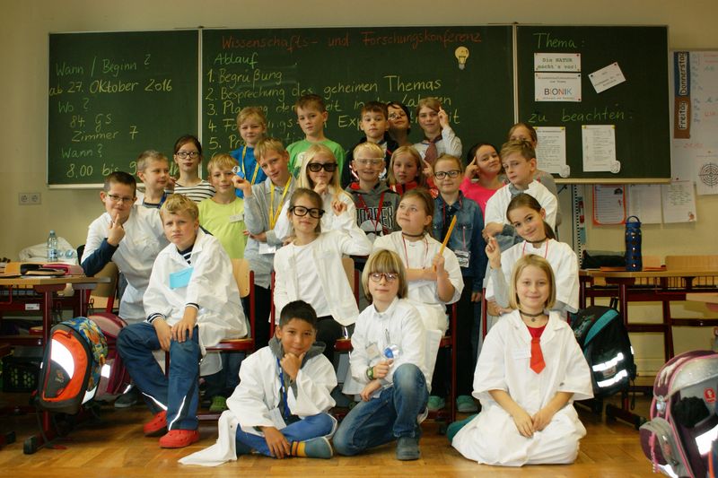Professor Dr. Dr. Bionikus lud die Klasse 4b ein zu einer wissenschaftlichen Konferenz zum Thema Bionik. Die Nachwuchs-Professoren forschten zum Lotus-Effekt, zum Raketenantrieb, zu Flugobjekten, zur Kraft von Eierschalen und verschiedenen Falttechniken... kurz gesagt: zu Phänomenen der Natur, die der Mensch nutzen kann.