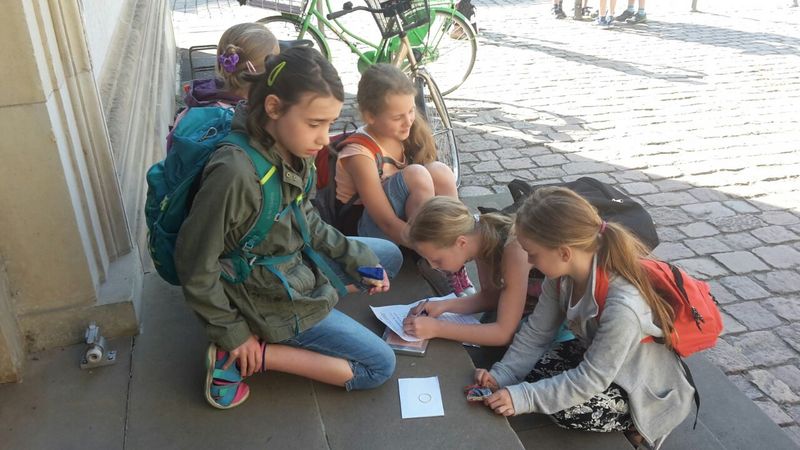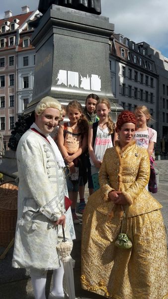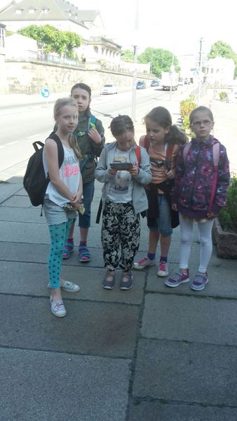 Zuerst fuhren wir noch gemeinsam in die Dresdner Altstadt. Doch schon nach der Ankunft teilten wir uns in fünf 5er-Gruppen auf, um die Sehenswürdigkeiten der Stadt auf einer Schnitzeljagd kennenzulernen. Doch bevor wir starten konnten, mussten wir zuerst unser Sachkundewissen aus Klasse 3 in einem Quiz unter Beweis stellen. Mit dem Lösungswort konnten nach und nach alle 5er-Gruppen in die spannende Entdeckertour durch Dresdens Altstadt starten. Dabei lernten wir viel über die Sehenswürdigkeiten unserer Stadt und schauten an einigen Stellen besonders genau hin, um den nächsten Tipp zu finden. Sogar August der Starke und Gräfin Cosel liefen uns über den Weg! Am Ende kamen alle Gruppen ans Ziel. Zu Belohnung ließen wir uns noch ein Eis schmecken.