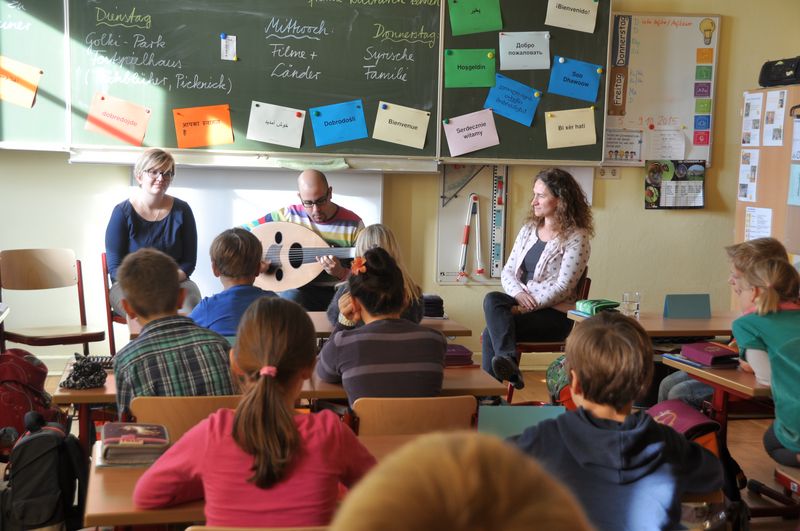 Kinder behutsam an das derzeitige Flüchtlingsthema heranzuführen, stand dabei im Mittelpunkt. Die Kinder konnten in dieser Woche einem syrischen Musiker und seiner Laute zuhören und ihm Fragen stellen.