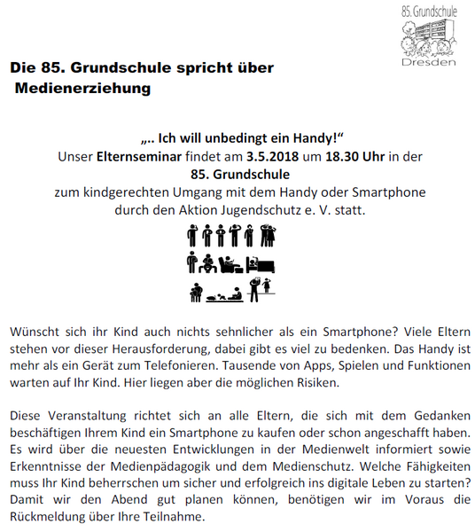 Sehr geehrte Eltern, hiermit möchte ich auf eine Veranstaltung der 85. Grundschule aufmerksam machen. Interessierte Eltern melden sich bitte bis Freitag, den 27.04.2018 über unsere Email- Adresse: grundschule.hellerau@t-online.de an.