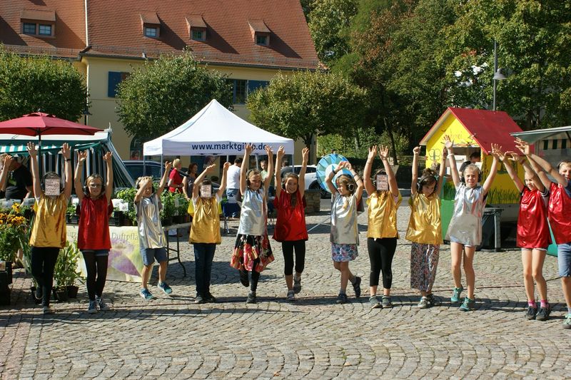 Einmal mitten auf dem Hellerauer Markt Luftklavier spielen und Teil einer tanzenden Bande sein? Das Performance-Kollektiv LIGNA lud unsere 3. und 4. Klassen dazu ein, an einem außergewöhnlichen Stück teilzunehmen - ausgestattet mit Kopfhörern, über die ein Hörspiel läuft, in dem sich Erzählungen und Bewegungsanweisungen mischen. So erobern sie tanzend den Markt von Hellerau und probieren, wie man sich in einer Gruppe ohne Anführerin oder Anführer gemeinsam bewegen kann. Ideengeberin für das Stück ist die Choreografin Jenny Gertz (1891-1966), beinahe in Vergessenheit geratene Pionierin des Modernen Tanzes und Visionärin in der Arbeit mit Kindern. Vermittelt hat uns dieses Kunstprojekt Frauke Wetzel vom Festspielhaus Hellerau. Finanziell unterstützt wurden wir durch den Förderverein der 84. Grundschule-Hellerau e.V. - Ein fantastischer und ungewöhnlicher Wochenausklang!