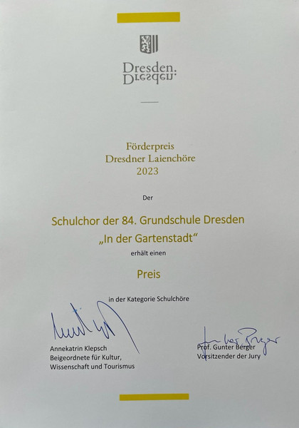 Am 02.06.2024 war es endlich so weit. Unser Chor durfte beim Preisträgerkonzert des "Förderpreises für Dresdner Laienchöre" auf der Bühne des Kulturpalastes zeigen, warum sie mehr als verdient gewonnen haben. Unter all den teilnehmenden Chören waren wir "die Kleinsten", doch nur dem Alter nach! Unsere Schülerinnen und Schüler gaben mit zwei ganz unterschiedlichen Stücken einen kleinen Einblick in ihr breitgefächertes Repertoire.