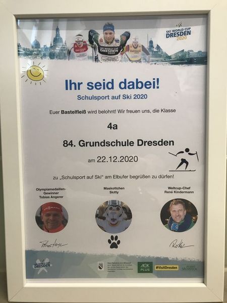 Am Montag überreichten Skitty – das Maskottchen des Ski Wourld Cup Dresden - und Jolinchen von der AOK die Teilnahmebescheinigung zu „Schulsport auf Ski“ am 22.12.2020. Mit diesem Bastelbewerbung haben es unsere Schülerinnen und Schüler der 4a geschafft!