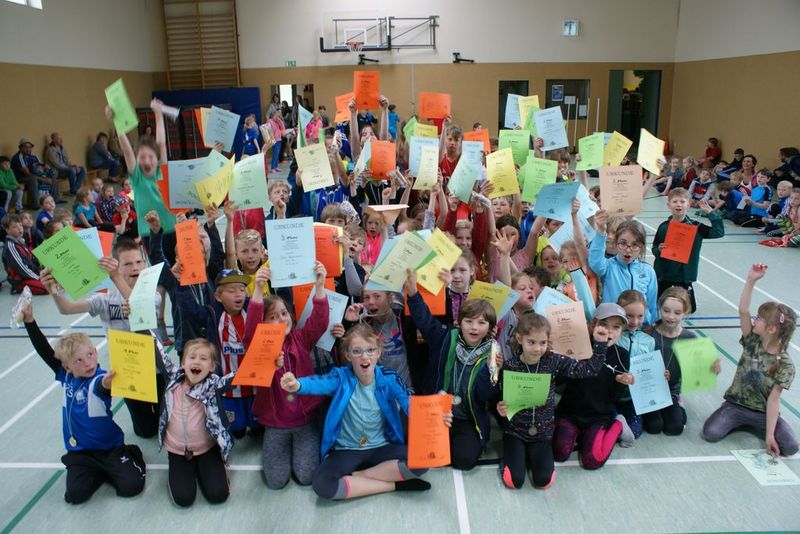 Bei bestem Wettkampfwetter fand am 29.05.2019 unser Sportfest statt. In den Disziplinen 50-Meter-Sprint, Schlagballweitwurf, Ausdauerlauf und Weitsprung kämpften unsere kleinen Sportler und Sportlerinnen um die begehrten Podestplätze. Viel Spaß hatten unsere Kinder auch beim Staffellauf und den Sportspielen in den Pausen. Um 11.30 Uhr fand dann die heiß ersehnte Siegerehrung statt. Hat es für einen Platz auf dem Treppchen gereicht oder waren andere doch schneller? Stolz, ausgepowert und mit Medaillen behangen fuhren wir zur Schule zurück.