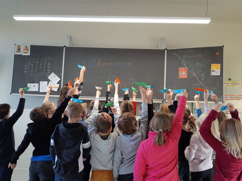 Während unsere Patenkinder die Ausstellung anschauten, hielten wir uns wegen der Corona- Kontaktregeln nicht im „Museum“ auf. Wir gingen ins Klassenzimmer unserer Patenklasse. Dort fanden wir wundervoll gebastelte und beschriebene Bötchen vor, die wir uns sogar mitnehmen durften.