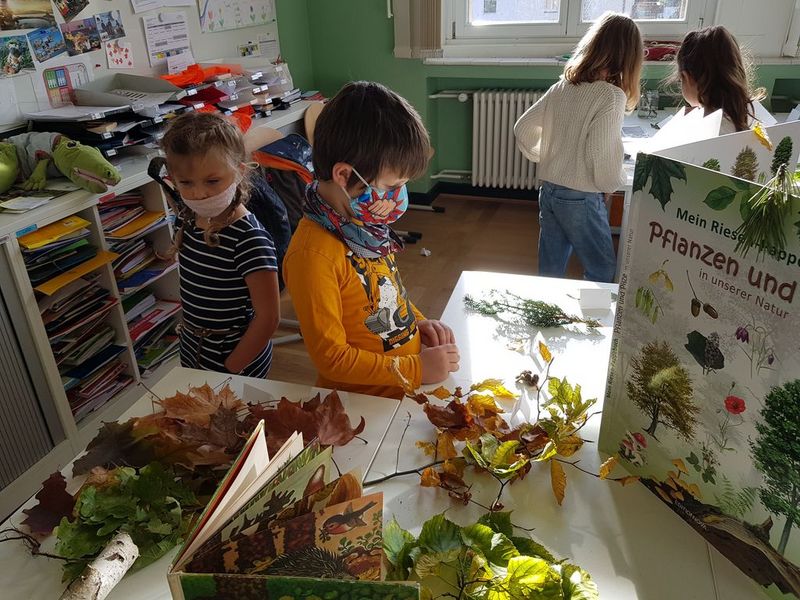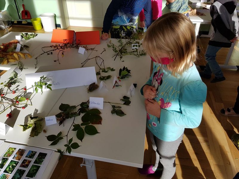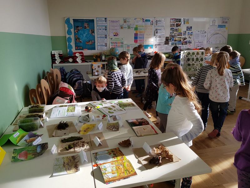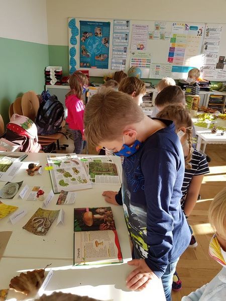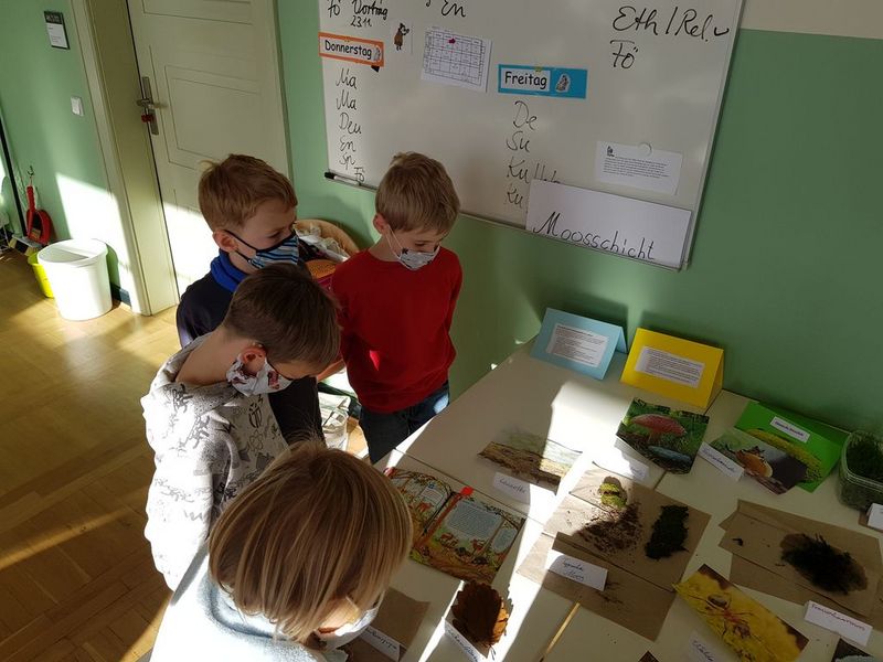 Jedes Kind unserer Klasse hat am Wochenende etwas zum Thema „Schichten des Waldes“ gesammelt und mitgebracht. In der Schule haben wir dann gruppenweise die Tische aneinander geschoben, unsere schönen Museumsstücke sortiert und ausgestellt. Kleine Schildchen zur Erklärung für die Besucher schrieben wir natürlich auch noch. Schließlich sollte man in unserem Museum etwas lernen! Sogar Hintergrundmusik ließen wir laufen, damit es richtig gemütlich wird.