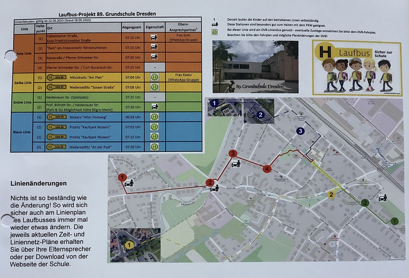 Vier Halte(treff)-punkte und vier „Buslinien“ gibt es hier sowie je „Linie“ zwei Verkehrshelferinnen, die gemeinsam mit den Kindern die letzten Meter gehen. Und es gibt eine „Kiss and go“-Zone, in der sich die Eltern von ihren Kindern gebührend verabschieden können.