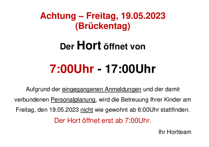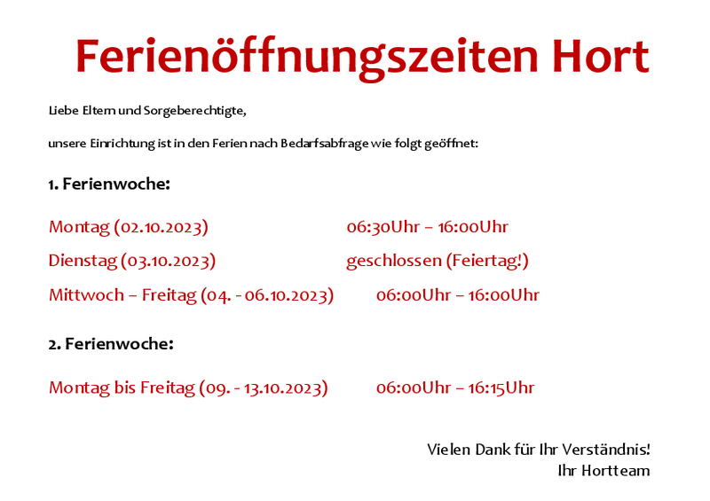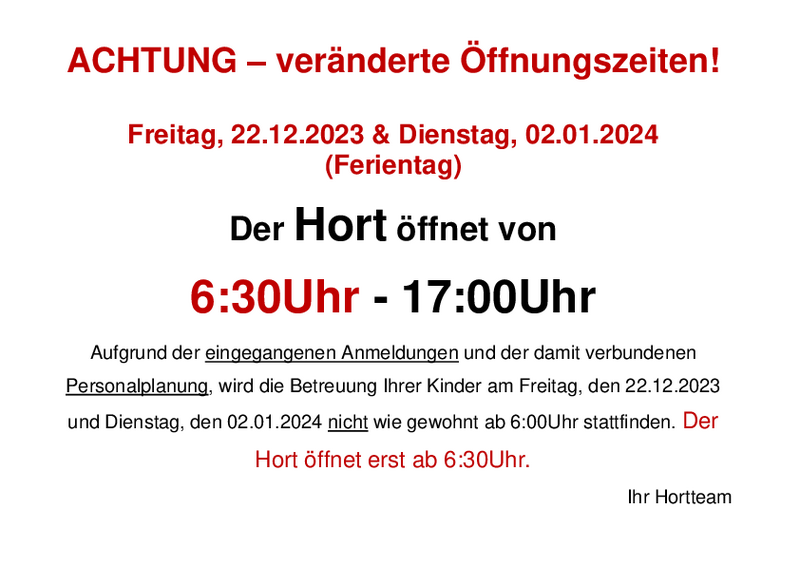 Der Hort hat an diesem Tag bis 14:45 Uhr geöffnet (siehe Elternbrief).