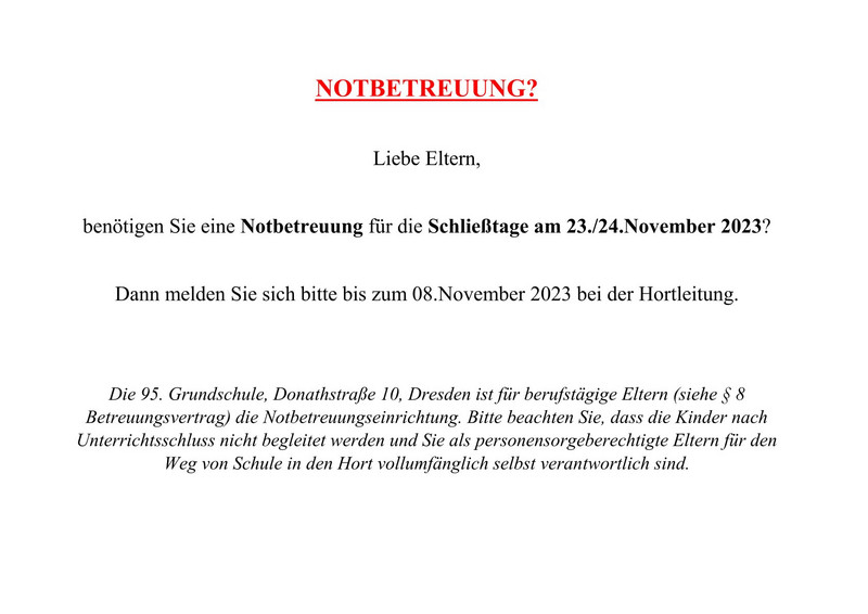 Sollten Sie einen Betreuungsbedarf haben, zeigen Sie diesen bitte bis Freitag, den 01.11.2024 bei der Einrichtungsleitung an. Die Notbetreuung nach der Schulzeit wird der Hort der 95. Grundschule, Donathstraße übernehmen.