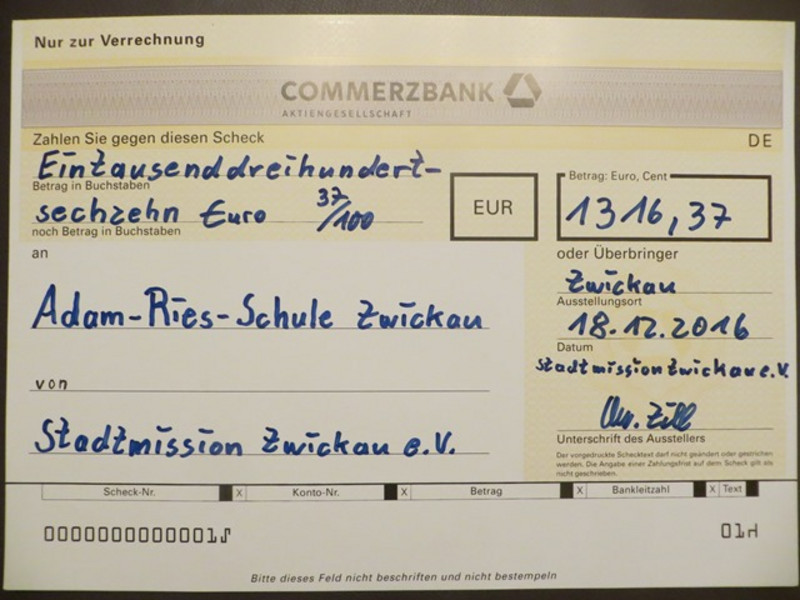 • Am 18.12.2016 waren wir zu einem Gottesdienst in die Michaeliskirche nach Wilkau-Haßlau von der Stadtmission Zwickau eingeladen. Die Mitarbeiter spendeten im Jahr 2016 ihre Rest-Cent. Für uns ergab sich daraus die stolze Summe von 1316,37 €.