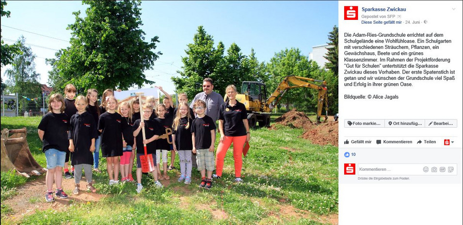 Liebe Eltern, vor einiger Zeit hatten wir Ihnen schon angezeigt, dass wir den SCHULGARTEN sehr gern direkt in das Außengelände unserer Adam-Ries-Schule integrieren würden und ein GRÜNES KLASSENZIMMER entstehen soll - kurzum eine OASE für unsere Mädchen und Jungen schaffen wollen, die zum Lernen, Spielen und zum Erholen einen maßgeblichen Beitrag leisten wird. Dazu wurde mit der Stadt Zwickau im Vorfeld ein Plan erstellt, in den Sie zum "Tag der offenen Tür" am 19.8.2016 im Schulhaus Einsicht nehmen konnten. Bereits nach den Herbstferien starteten wir eine erste Pflanzaktion, bei der wir von 10 Eltern des Elternrates, zwei Schülern und vier Lehrerinnen unterstützt wurden. Wir hatten Naschsträucher in einer Hecke gesetzt. Nun hoffen wir, dass sie gut anwachsen. Die ehemaligen Klassen 4b und 4c des Abgangsjahres 2015 sponserten mit ihren Eltern einige Pflanzen. Dafür sagen wir noch einmal herzlich Danke. Nun sind nur wenige Monate vergangen und uns haben große Spenden erreicht, die beim Förderverein der Schule eingegangen sind: