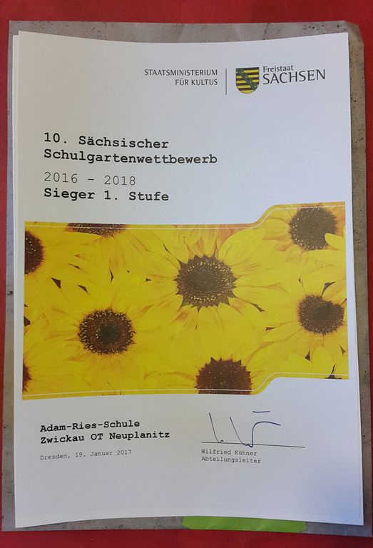 Stolz können wir Ihnen auch berichten, dass sich die Adam-Ries-Schule am 10. Sächsischen Schulgarten-Wettbewerb des SMK "Aus Grau mach Grün" beteiligt hatte. Am 16.12.2016 wurde uns mitgeteilt, dass wir zu den 30 Preisträgern der 1. Runde gehören. Nun wurden wir ins Kultusministerium eingeladen, dort werden wir unser Projekt vorstellen und mit einem Plakat präsentieren.