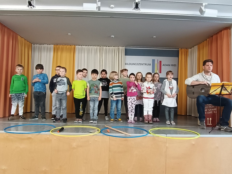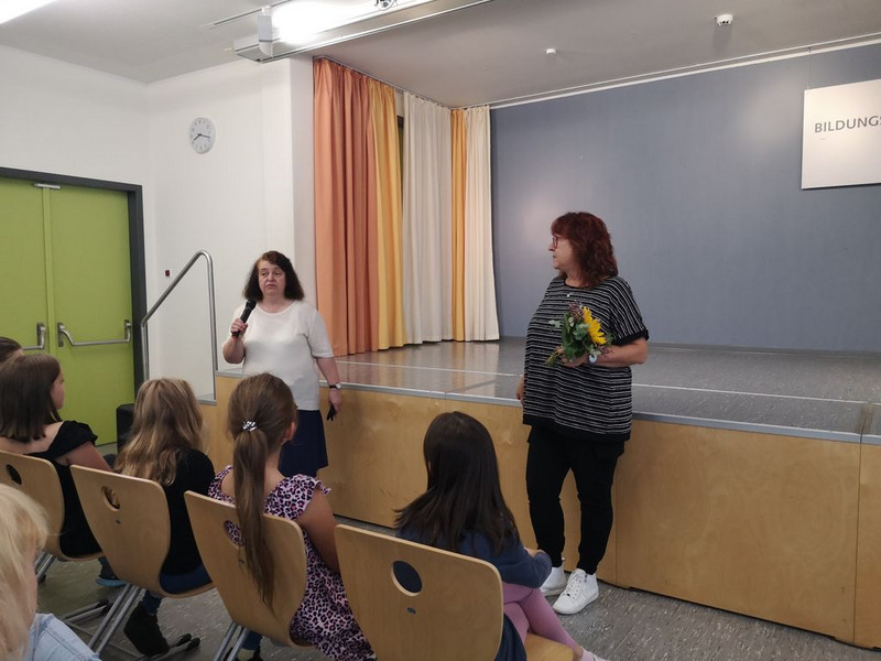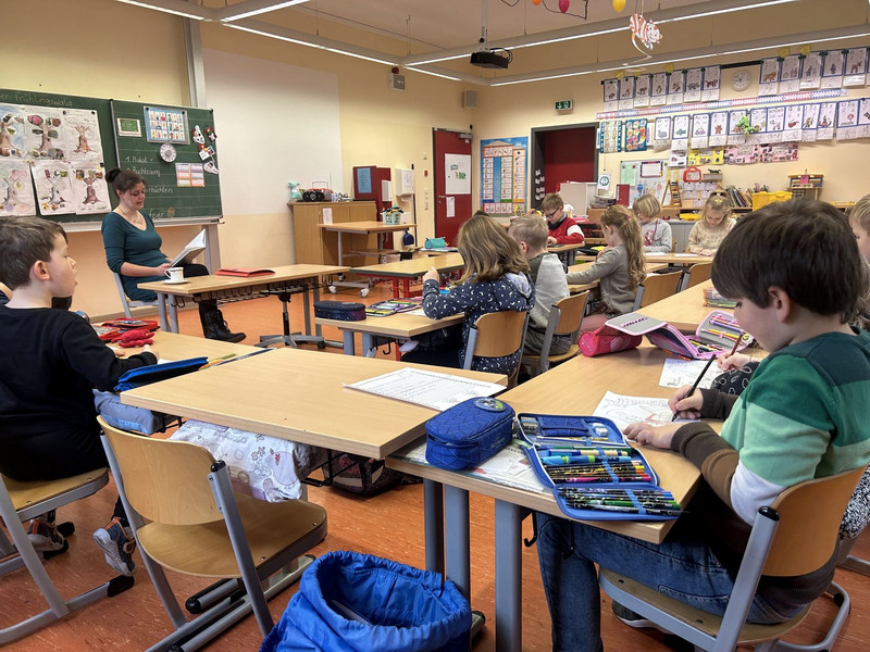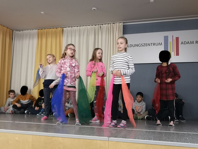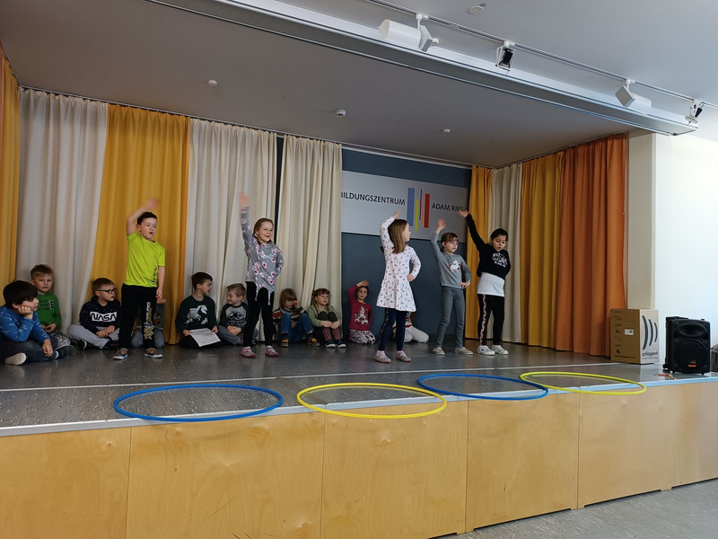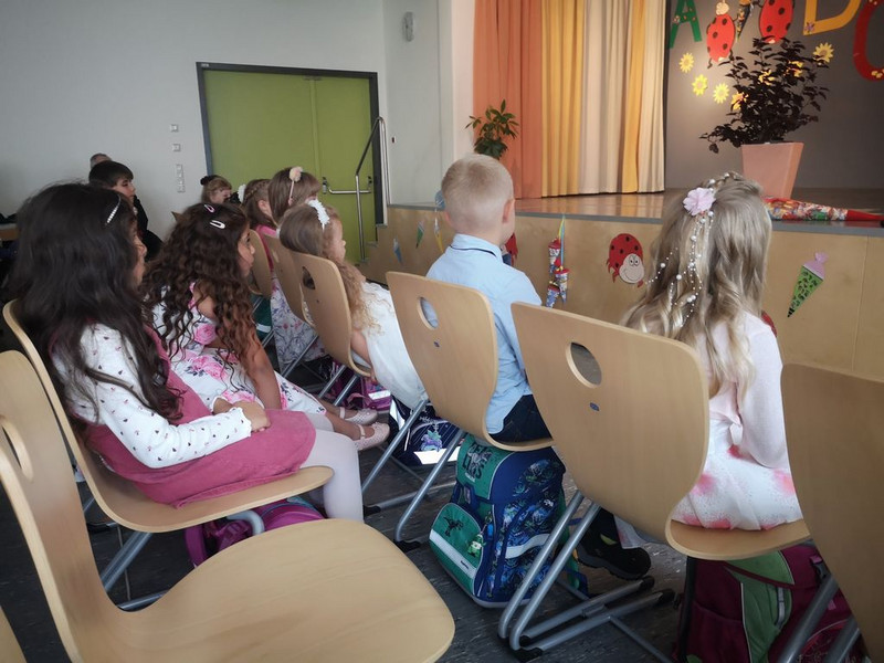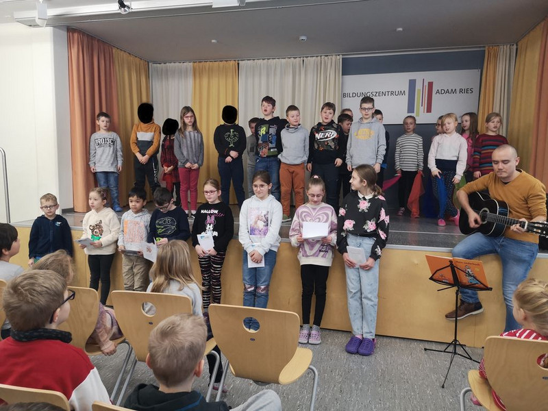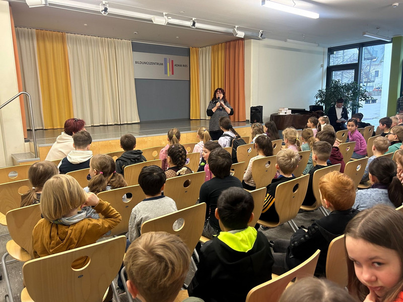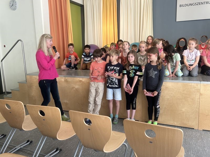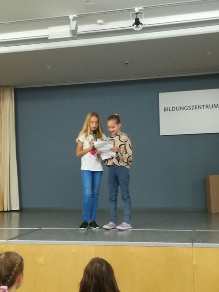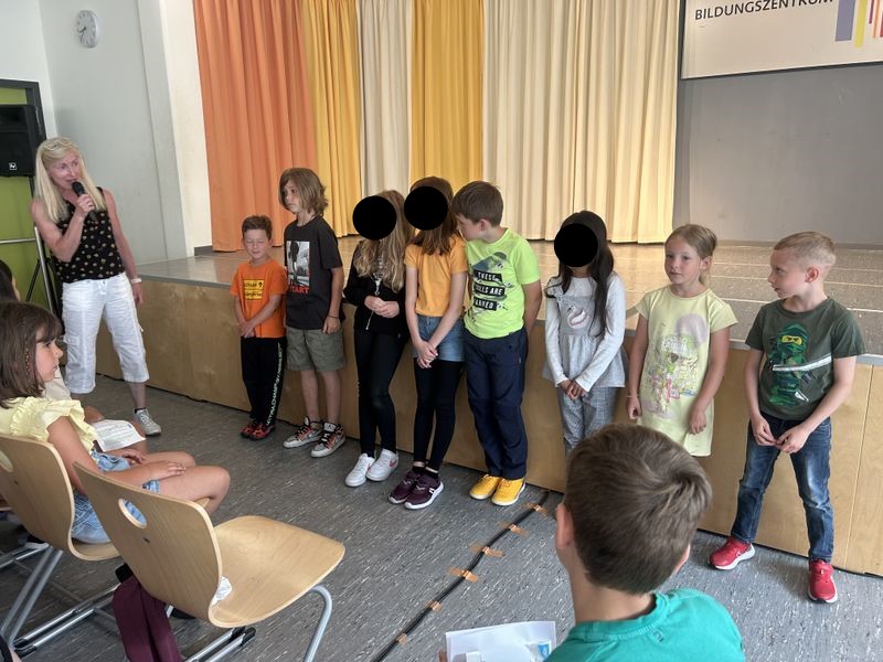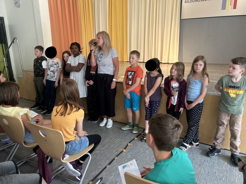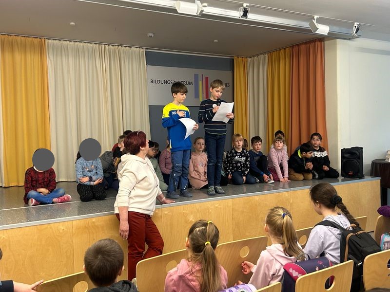Am ersten Schultag nach den Osterferien begrüßten wir gemeinsam in der Aula alle ukrainischen Schülerinnen und Schüler. Dazu sang der Chor einstudierte Lieder, alle Lehrer stellten sich noch einmal vor und die Drittklässler hielten extra eine kleine Begrüßungsrede. Ab sofort nehmen die ukrainischen Kinder mindestens einen Tag in der Woche am regulären Unterricht teil und lernen die Klasse kennen. Außerdem werden sie auch in den Fächern Sport, Werken, Kunst und Englisch mit uns gemeinsam lernen.