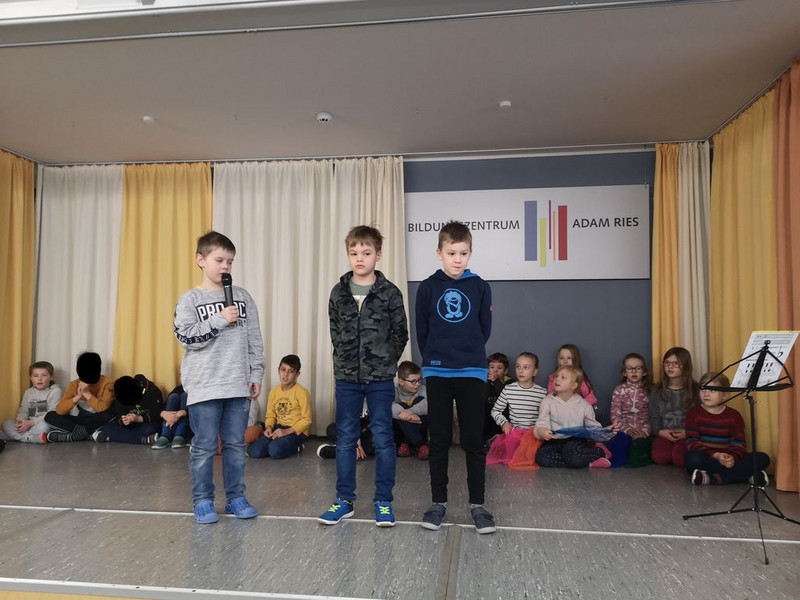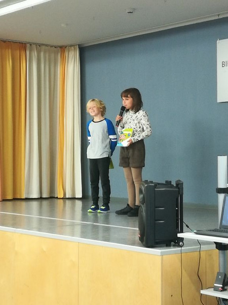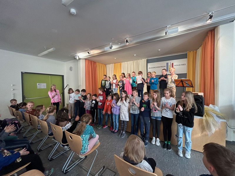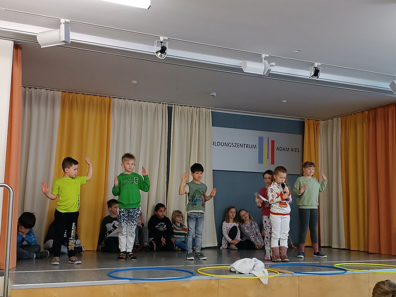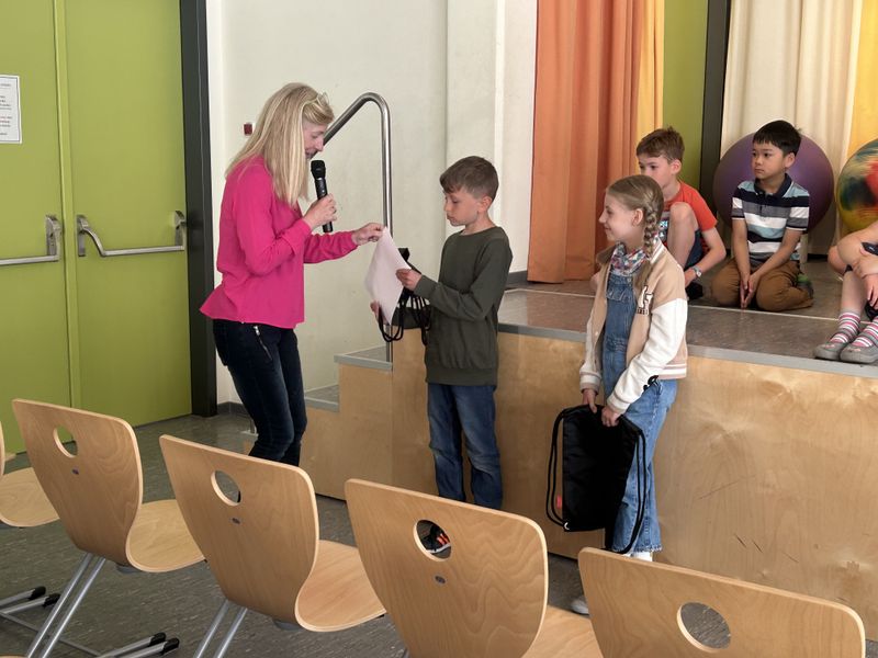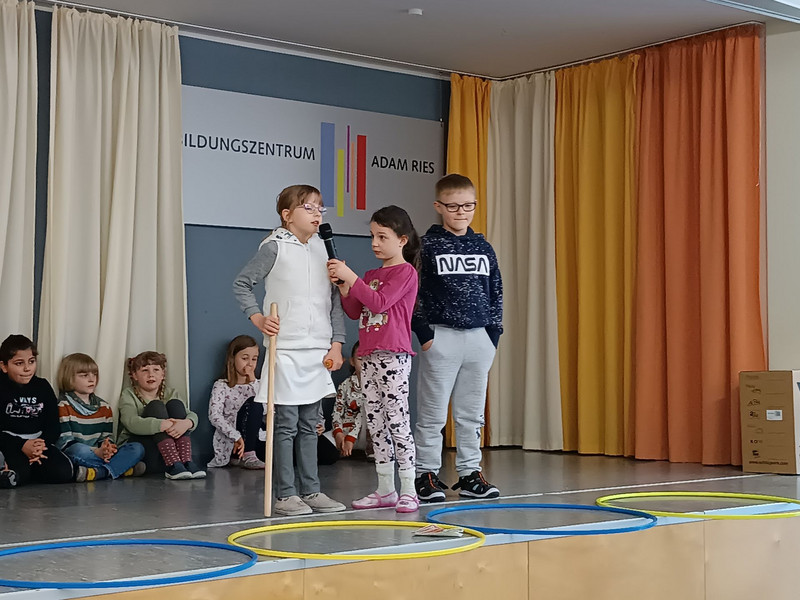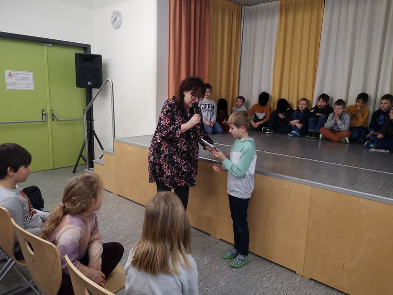 Im neuen jahr 2023 begrüßte uns die Klasse 2b zum Aulatreff. Unsere erfolgreichsten Teilnehmer der Mathe-Olympiade erhielten einen Preis und dürfen auch am 2.2. an der nächsten Stufe der Olympiade teilnehmen. Symbolisch wurde auch einer Vertreterin des Tierheims Neu-Amerika eine Dose Hundefutter übergeben und sie bedankte sich für die zahlreichen Futterspenden, die in den letzten Wochen bei uns abgegeben wurden. Ganz herzlich gratuliert wurde auch wieder unseren Geburtstagskindern und das Publikum konnte sich danach beim Vorlesen einer Pumuckl-Geschichte entspannt zurücklehnen. Musikalisch unterhielt uns die Klasse 2b mit dem Lied "Meine Biber haben Fieber", einem Duett und dem Lied "Das Auto von Lucio", gesungen mit dem Chor.