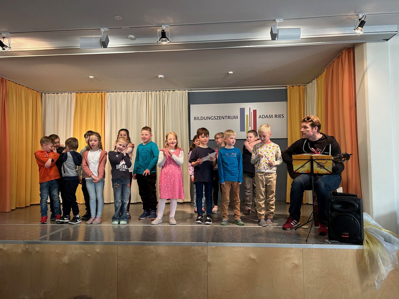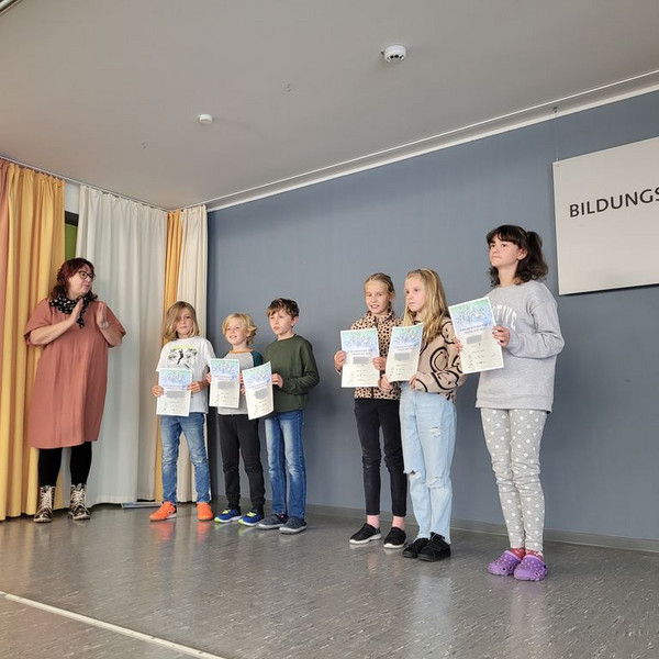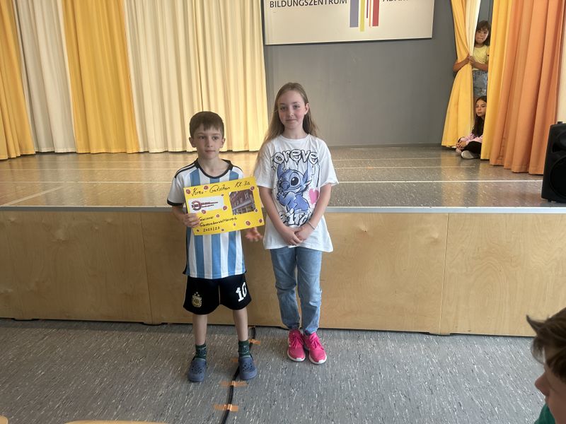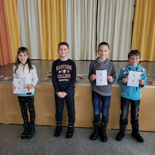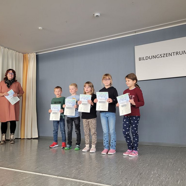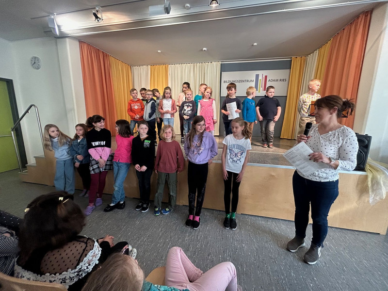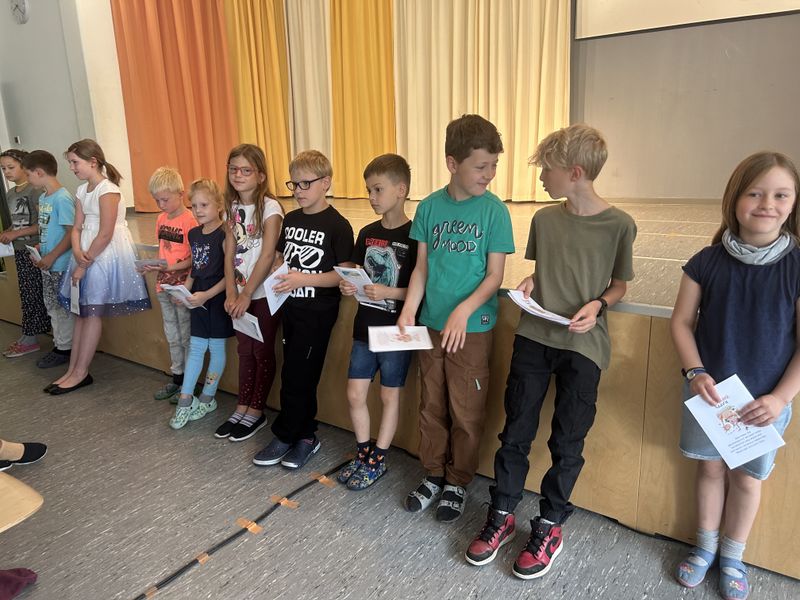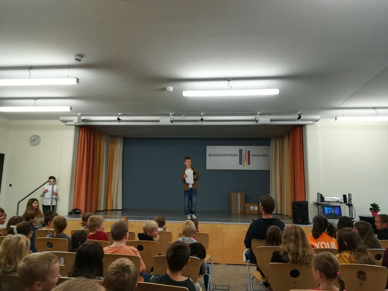 Im neuen jahr 2023 begrüßte uns die Klasse 2b zum Aulatreff. Unsere erfolgreichsten Teilnehmer der Mathe-Olympiade erhielten einen Preis und dürfen auch am 2.2. an der nächsten Stufe der Olympiade teilnehmen. Symbolisch wurde auch einer Vertreterin des Tierheims Neu-Amerika eine Dose Hundefutter übergeben und sie bedankte sich für die zahlreichen Futterspenden, die in den letzten Wochen bei uns abgegeben wurden. Ganz herzlich gratuliert wurde auch wieder unseren Geburtstagskindern und das Publikum konnte sich danach beim Vorlesen einer Pumuckl-Geschichte entspannt zurücklehnen. Musikalisch unterhielt uns die Klasse 2b mit dem Lied "Meine Biber haben Fieber", einem Duett und dem Lied "Das Auto von Lucio", gesungen mit dem Chor.
