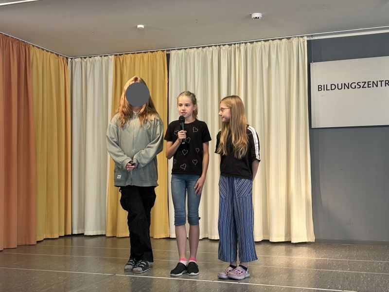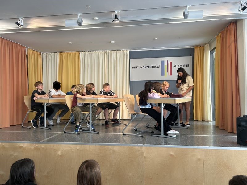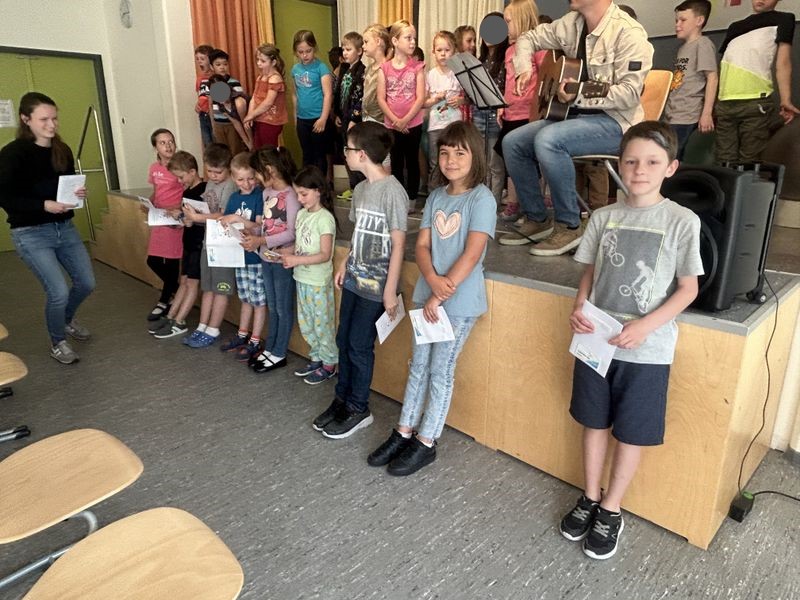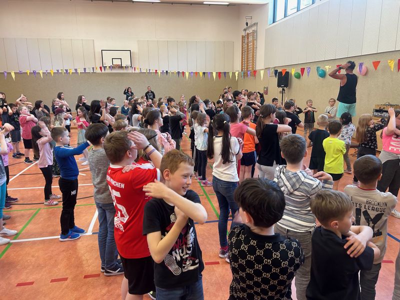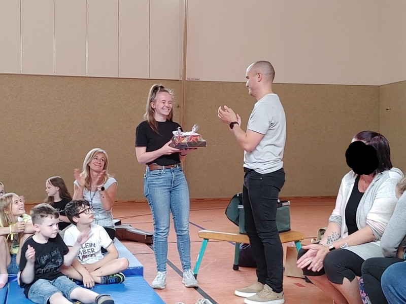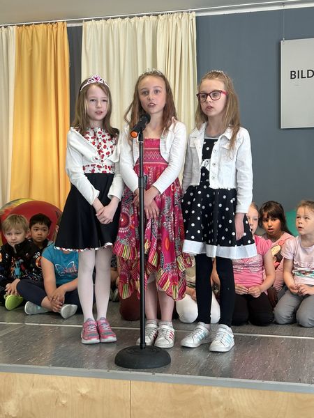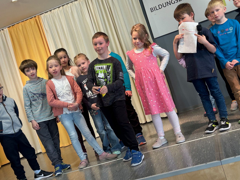 Den Aulatreff im Mai begann die verantwortliche Klasse 1a mit einem Lied, später hörten wir noch das Gedicht von den besonderen "Kätzchen", sahen einen Zaubertrick und einen Tanz. Da auch wieder einige Wettkämpfe anstanden, wurde auch noch einmal den Teilnehmern der Hallenkreismeisterschaft Athletik und des Kreisausscheides 2-Felderball für ihren Einsatz gedankt. Außerdem wurden die Platzierten des Lesewettbewerbs bekannt gegeben, wir hörten einen selbstgemachten Podcast vom Osterprojekt und gratulierten unseren Geburtstagskindern. Happy Birthday!