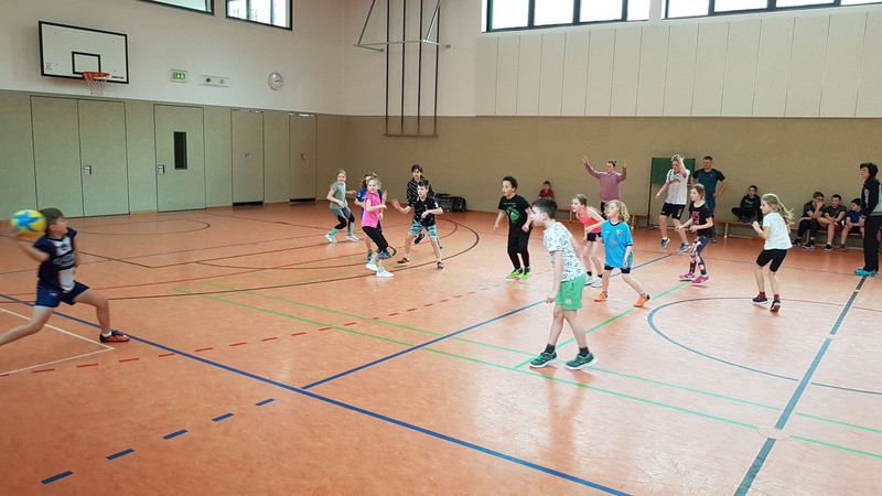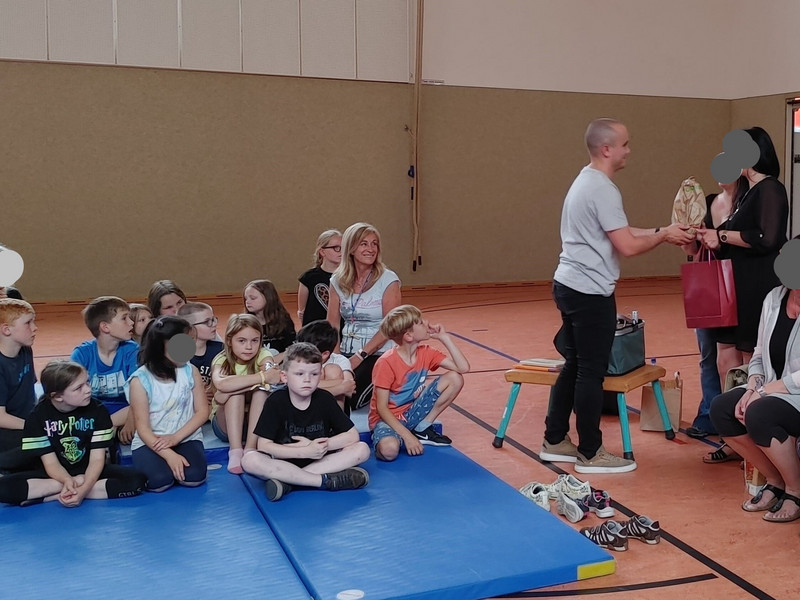 Mit Keksen, Limo und Musik feierte die Klasse 2b am 23.06. ihren Abschluss der zweiten Klassenstufe. Viele Kinder und Eltern waren da und trotz des schlechten Wetters draußen wurde es in der Turnhalle gesellig. Die Kinder, Frau Kästner, Frau Ruttloff, Herr Bräuer, Mütter, Väter und Geschwister sind miteinander ins Gespräch gekommen und konnten über schulische und außerschulische Themen plaudern. Nachdem die Kinder Lieder gesungen und sich dabei mit den Eltern zusammen bewegt haben, wurde es auch etwas emotional. Herr Bräuer hat offiziell die Klassenlehrertätigkeit an Frau Ruttloff übergeben. Das war traurig, aber andererseits könnte es kaum eine Lehrerin geben, die besser geeignet wäre, da sie die Kinder bereits anderthalb Jahre in mehreren Fächern begleitet. Sie wurde außerdem zu ihrem bestandenen zweiten Staatsexamen von allen Seiten beglückwünscht. Die tolle und wichtige Arbeit von Frau Kästner als Erzieherin wurde ebenfalls ausdrücklich anerkannt und auch Frau Eichhorn und Frau Wendler als zuverlässige und vertrauensvolle Elternsprecherinnen erhielten ein Dankeschön für ihre Tätigkeit. Höhepunkt für die Kinder war mit Sicherheit das Zwei-Felderballspiel gegen die Eltern. "Wir machen euch fertig" tönten die Zweitklässlerinnen und Zweitklässler vor dem Spiel, doch trotz der Unterstützung durch Herrn Bräuer waren ihnen die Eltern in Sachen Fang- und Wurftechnik weit überlegen. Es braucht wohl noch etwas Zeit zum Wachsen, bis es zu einer Revanche auf Augenhöhe kommen kann. Alles in allem war es ein friedliches, freudvolles und gelungenes Abschlussfest für alle Beteiligten. Viel Erfolg und alles Gute für Frau Ruttloff als neue Klassenlehrerin der zukünftigen Klasse 3b!