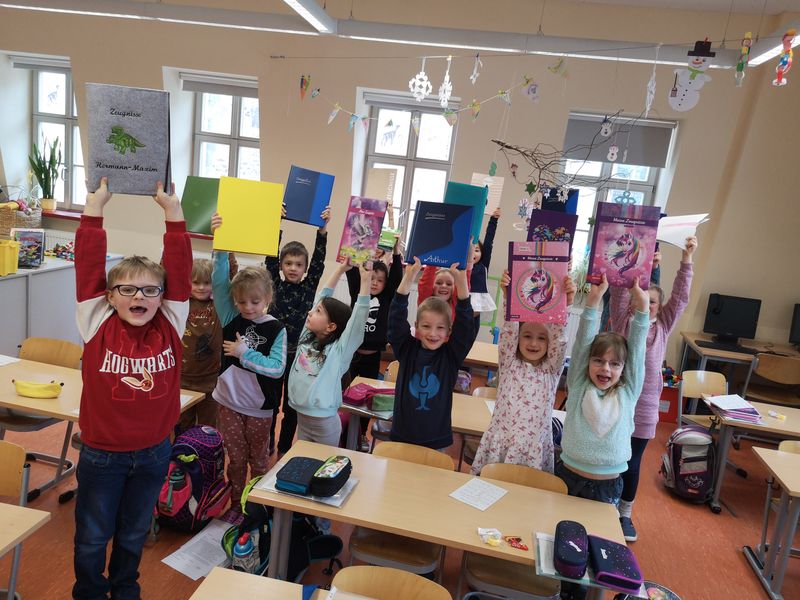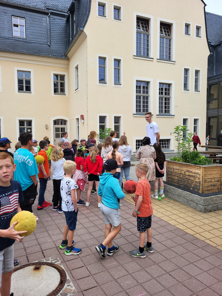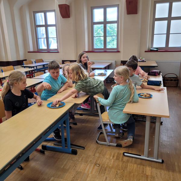 Einen gemeinsamen Tagesausflug auf die Burg Scharfenstein unternahmen die Klassen 1a und 1b. Mit dem Zug ging es zur Erlebnisburg - Das Motto dieses Jahr: Die Römer. Dort fädelten die Erstklässler Perlen auf, lernten spielerisch römische Zahlen kennen, haben einen Nachtisch gebacken und mussten eine alte römische Wasserleitung reparieren und zum "Laufen" bringen. Der Lohn war grüner Wackelpudding.