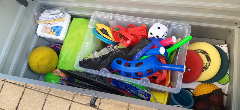 Wir haben mit allen Klassensprechern die Spielkiste ausgeräumt und neu sortiert. Alle haben sich fleißig beteiligt. Es war vieles kaputt. Nun brauchen wir noch neue Scheiben fürs Gleichgewichthalten.
