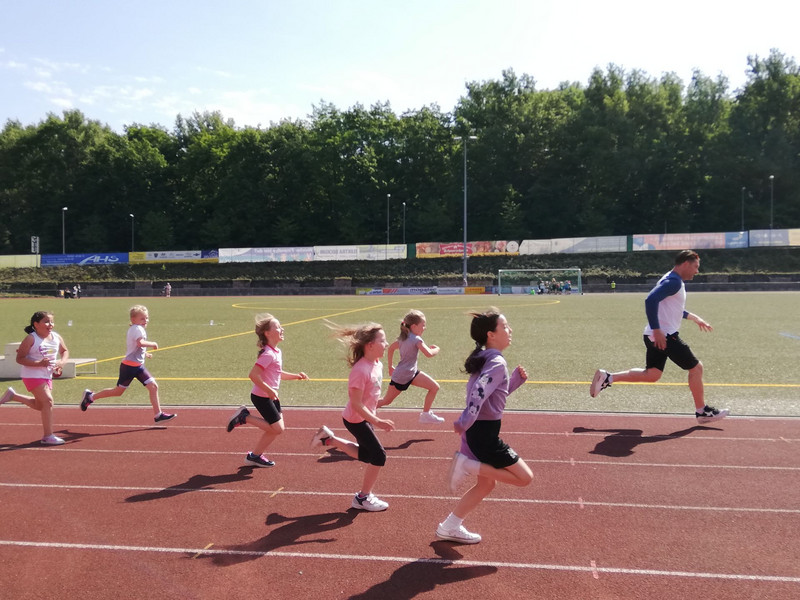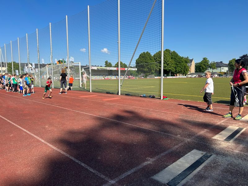 Nachdem alle Klassen auf dem Sportplatz eintrafen, ging es nach einer kurzen Erwärmung an die einzelnen Stationen Sprint, Weitsprung und Schlagball. Danach schafften es auch fast alle Kinder, den 800m-Lauf durchzuhalten. Die anschließende Siegerehrung für den Dreikampf konnte, da wir gut im Zeitplan lagen, auch schon stattfinden.