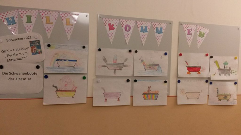 So wurde in der Kl.1 die Olchi-Geschichte "Tieralarm um Mitternacht", welcher die Kinder ganz gespannt und ausdauernd zugehört haben, vorgelesen. Anschließend durften die Kinder ihre eigenen Schwanenboote gestalten.