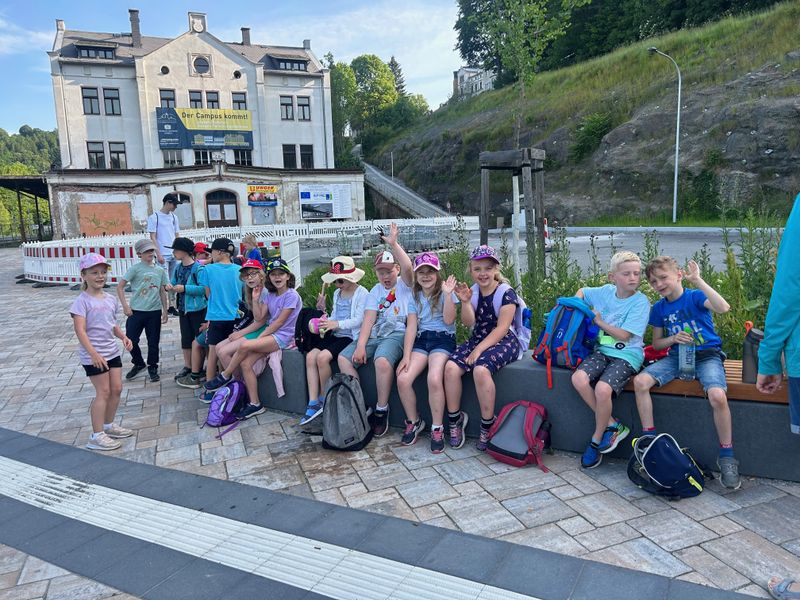 Am Kindertag wanderte die Klasse 1b zum Frohnauer Hammer. Dort erfuhren wir, wie ein Hammerwerk mit Wasserantrieb funktioniert, wie die Menschen damals lebten/arbeiteten und welche Traditionen im Erzgebirge immer noch gepflegt werden. Nachdem jeder noch sein eigenes Hammerwerk basteln durfte, gab es als Belohnung auch ein Eis.