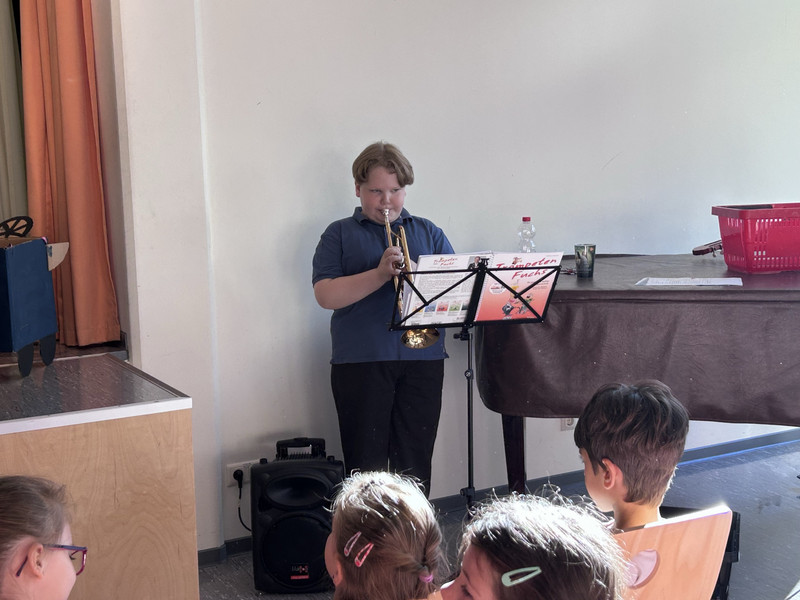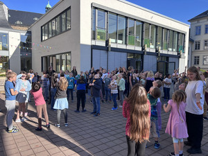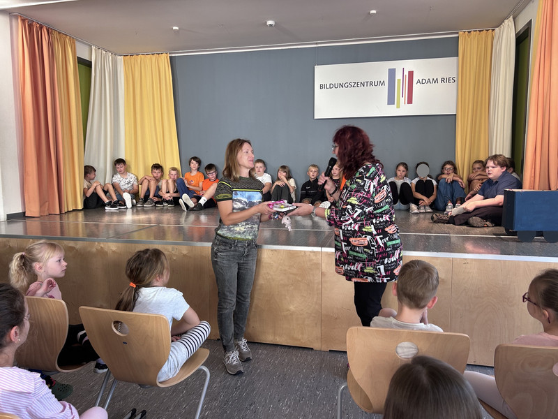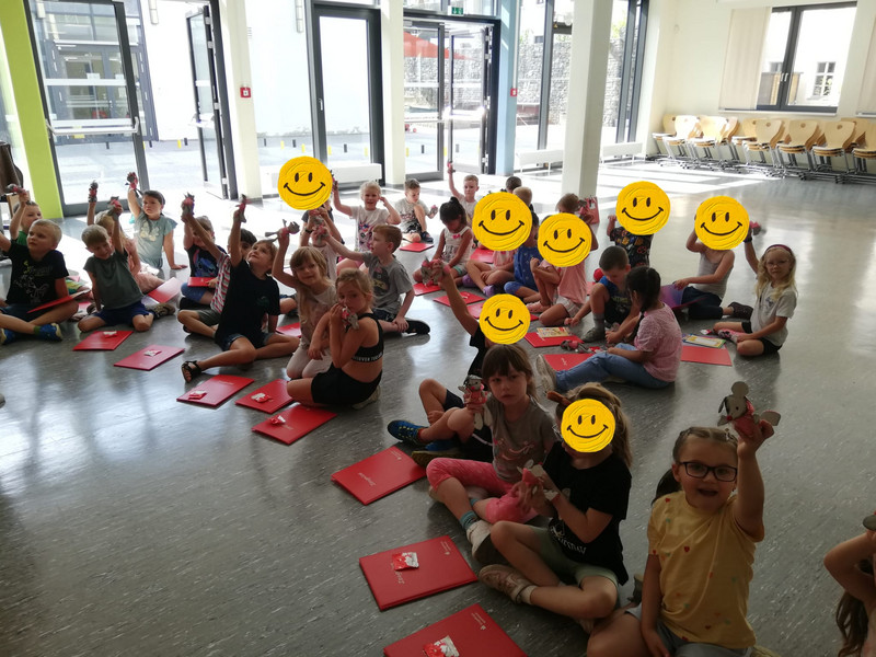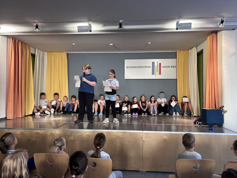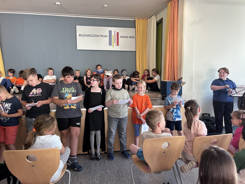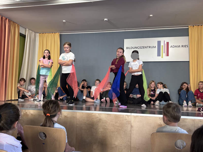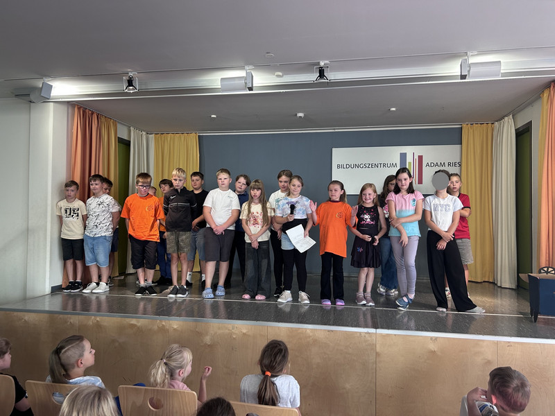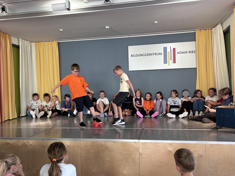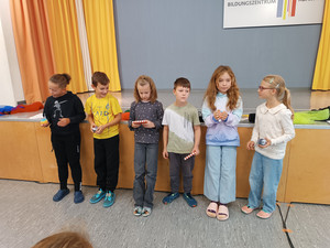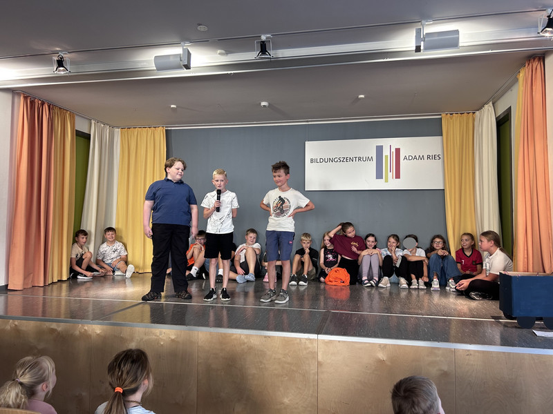 In das neue Schuljahr starten immer die Großen mit dem ersten Aulatreff. Die Klasse 4a sang unser Schullied, danach tanzten einige Mädchen zu Adel Tawil und wir hörten Witze. Frau Lindenborn stellte uns danach die einzelnen Klassensprecher und -sprecherinnen vor. Sie hatten alle das Klassensprecher-T-Shirt an und bekamen ihr Notizheft. Neu an unserer Schule ist auch Frau Rogachevskaia, sie kümmert sich ganz besonders um unsere DaZ-Kinder. Ein ganz tolles Trompetenständchen bekamen unsere Geburtstagskinder zu hören. Außerdem sahen wir einen Sketch und kleine Fußballtricks. Am Ende sang uns der Chor das Abschlusslied, sogar dreistimmig.