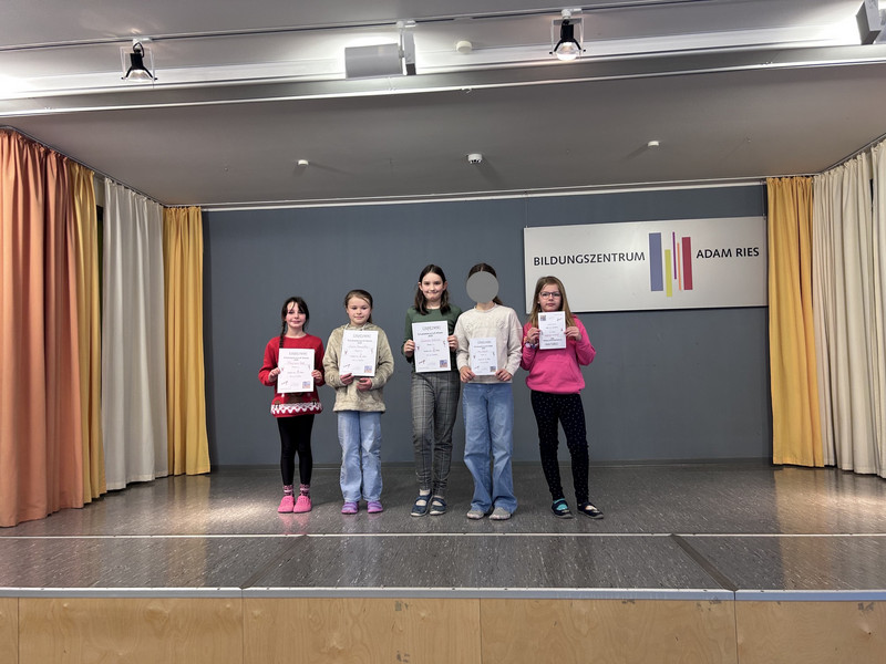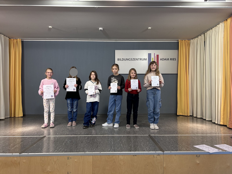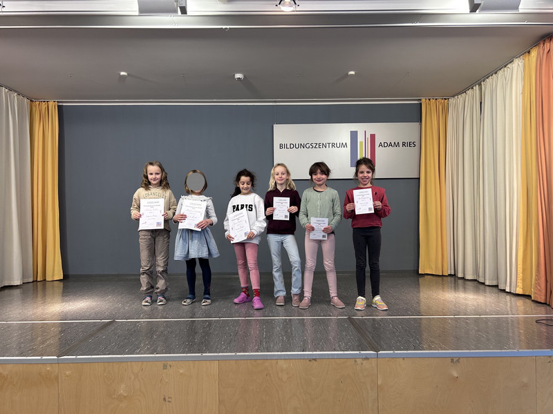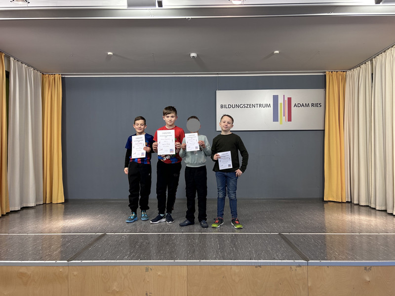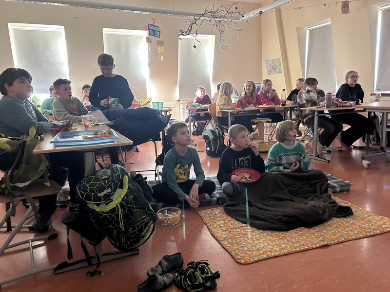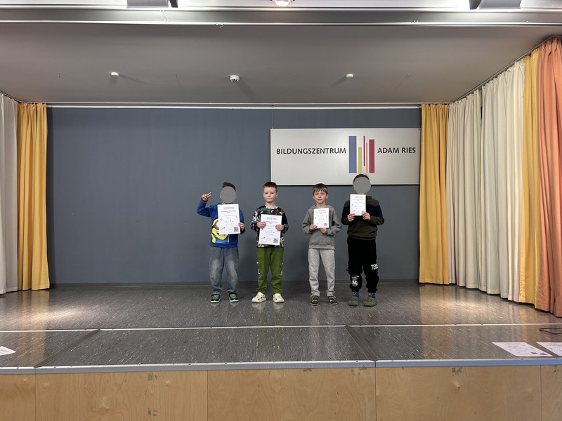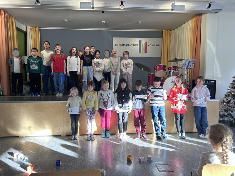 Gleich im Anschluss an das weihnachtliche Singen in der Annenkirche führten uns die Schüler der Kl.3a durch ihren Aulatreff. Das Lied von der Weihnachtsbäckerei durfte nicht fehlen, deutsche und ukrainische Gedichte hörten wir und die von den Schülern durchgeführte Kirchenrallye wurde uns auch vorgestellt. Für unsere Geburtstagskinder gab es ein Ständchen auf Englisch, Ukrainisch und Albanisch. Im Anschluss erhielten die Teilnehmer der sportlichen Wettkämpfe noch eine Teilnehmerurkunde und ein kleines Dankeschön. Auch B. aus der Klasse durfte sich über ein Geschenk als Belohnung für die Teilnahme am Logo-Mathezirkel freuen. Das abschließende Lied "Gute Laune" lud dann nochmal alle Kinder zum Mitmachen ein.