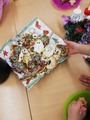 Wir haben Plätzchen verziert, Weihnachtslieder gesungen, der Weihnachtsmann hat für jedes Kind ein Geschenk dabei gehabt und zu guter Letzt durften die lecker verzierten Plätzchen natürlich auch verspeist werden.